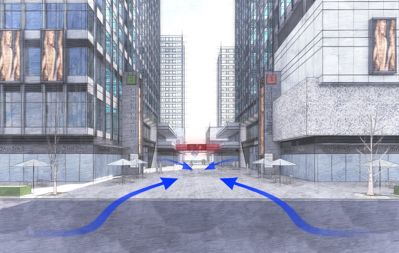 通過(guò)項(xiàng)目用地東西向的流線(xiàn)貫通,以更加主動(dòng)的姿態(tài)刺激街區(qū)人流聯(lián)動(dòng),落客區(qū)(建筑入口)與周邊環(huán)境實(shí)現(xiàn)本案“開(kāi)放式商務(wù)中心”的初衷。城市空間與建筑內(nèi)部空間的過(guò)渡上,充當(dāng)了兩種空間體系的緩沖空間,優(yōu)秀的外部空間設(shè)計(jì)更可以實(shí)現(xiàn)人流的引導(dǎo)以及空間的暗示,使得內(nèi)、外空間發(fā)生互動(dòng),增加了空間的趣味性。