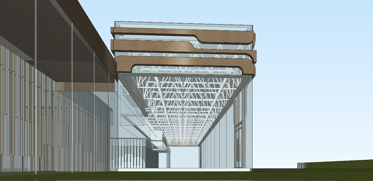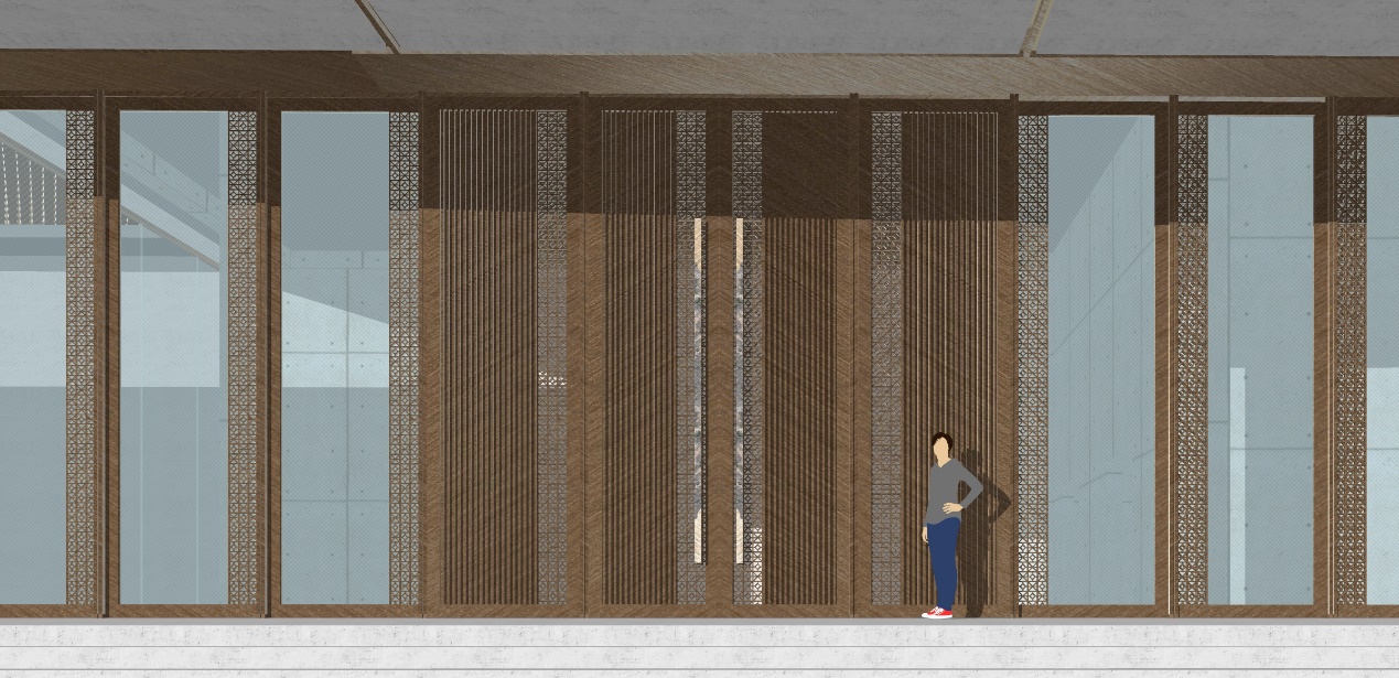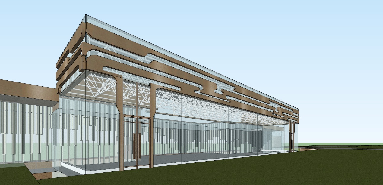 展示中心回歸典雅的比例,借著結(jié)構(gòu)調(diào)整的契機,將原2米高的鋼結(jié)構(gòu)網(wǎng)架形式改成不到1米的膠合木屋頂,修改了形體的比例,降低了建筑高度,回歸建筑美學(xué)的本質(zhì)。