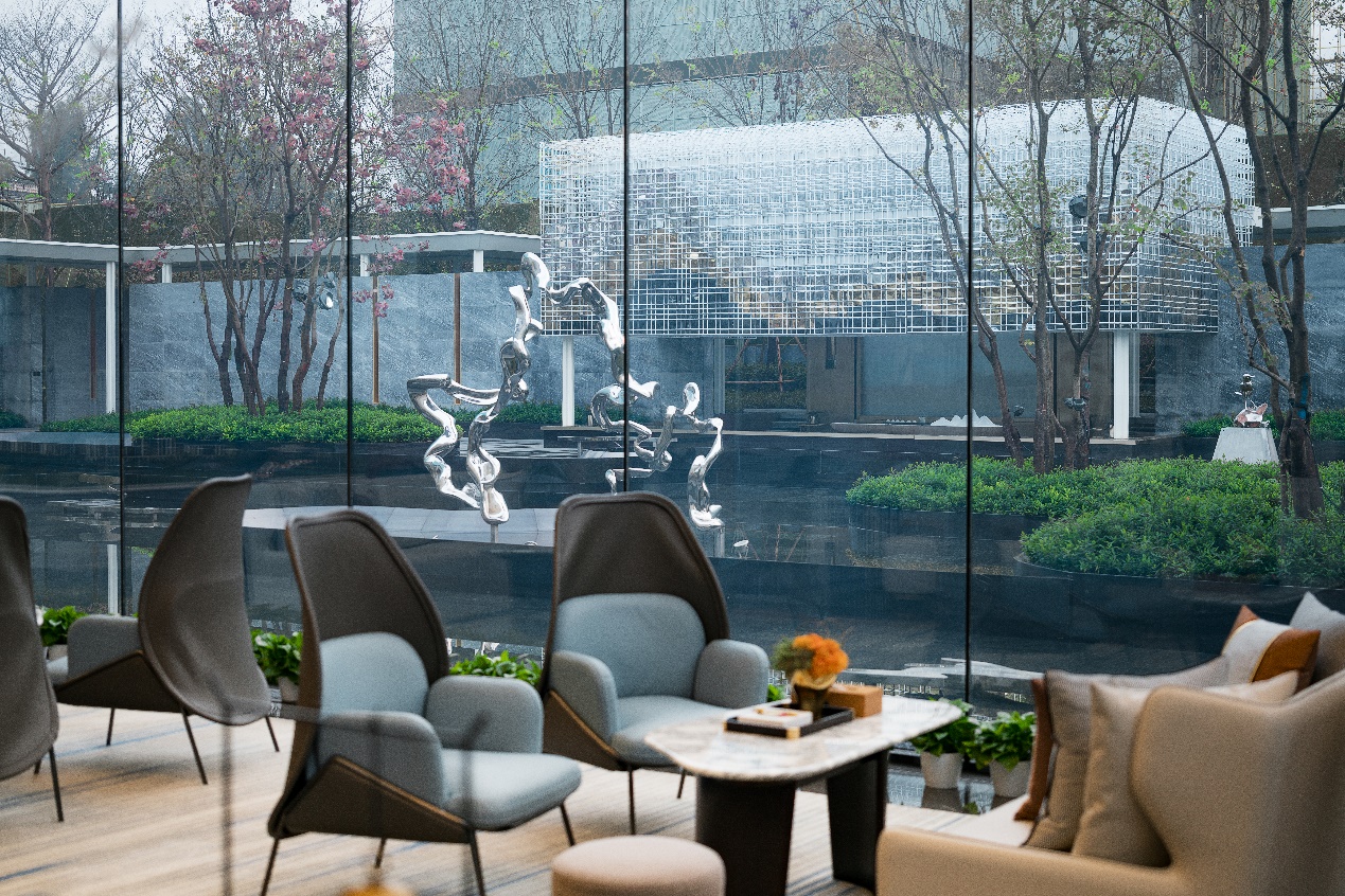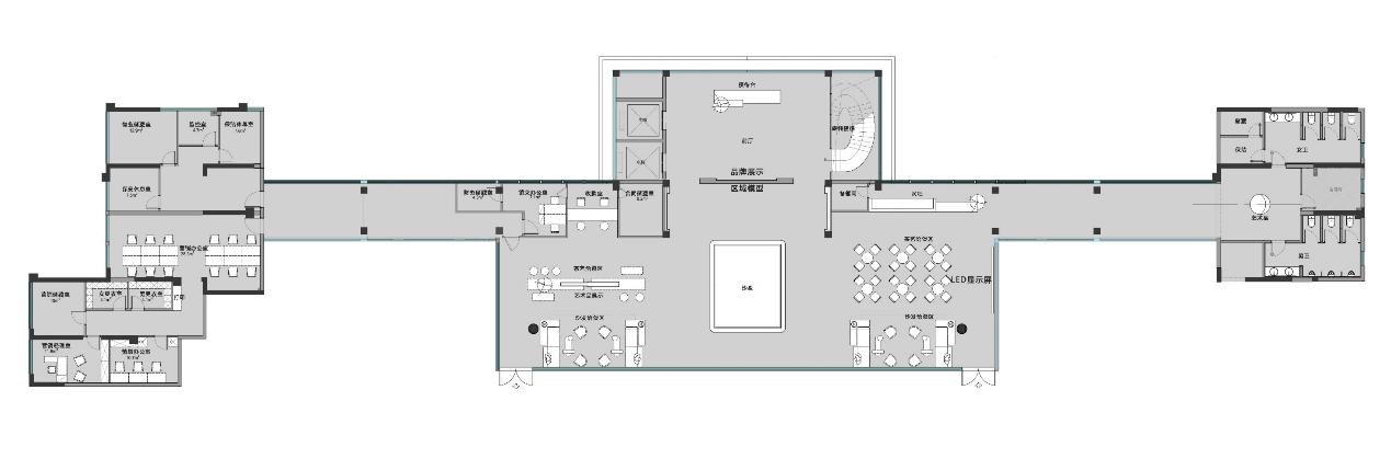 展示廳能達到極致開敞的效果,是因為260平米中只有兩根立柱,跨度達到25.6米。7米無肋通高玻璃幕墻,極致虛無,室外景觀室內(nèi)化,模糊了空間界線。從空間開合,功能布局,材料運用,景觀布置,都為了人的體驗感而存在,這就是建筑的意義。