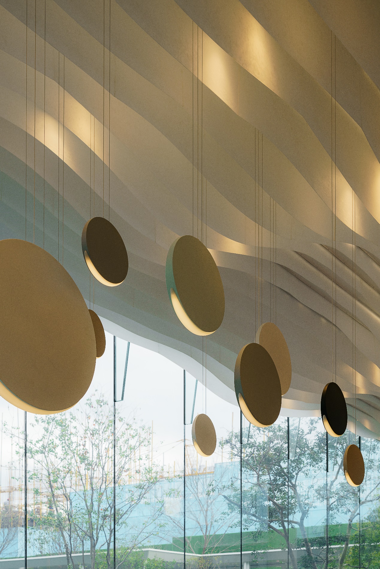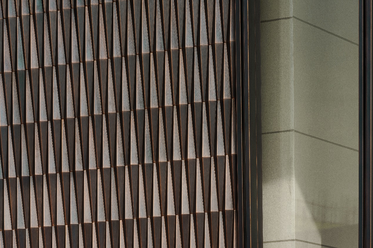 參數(shù)化設(shè)計的柵格外表皮幕墻,表達了云的律動,以靜寫動,非簡單的云的形象。很多設(shè)計習(xí)慣于把具體的形狀映射到立面上,而本案中設(shè)計師將形轉(zhuǎn)化為像,將云千姿百態(tài)變化的瞬間凝固在這幕墻之上。