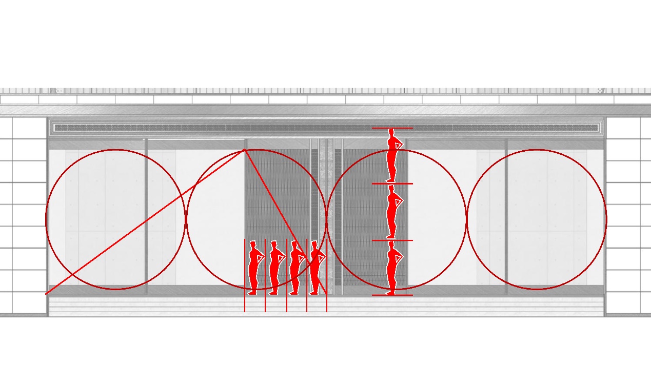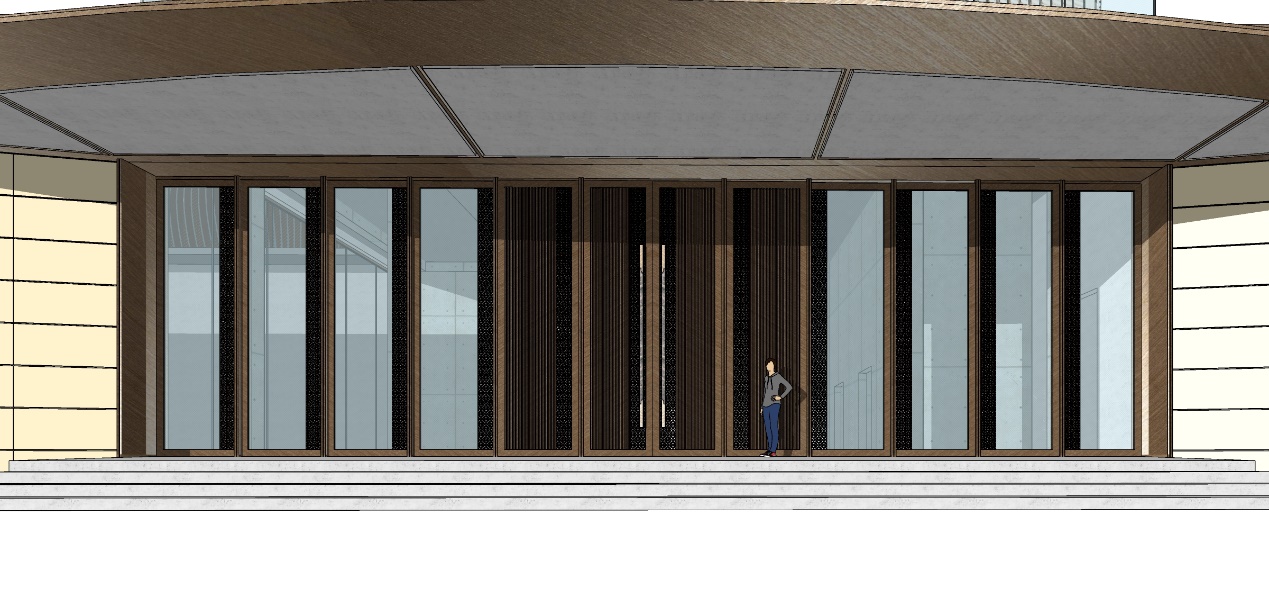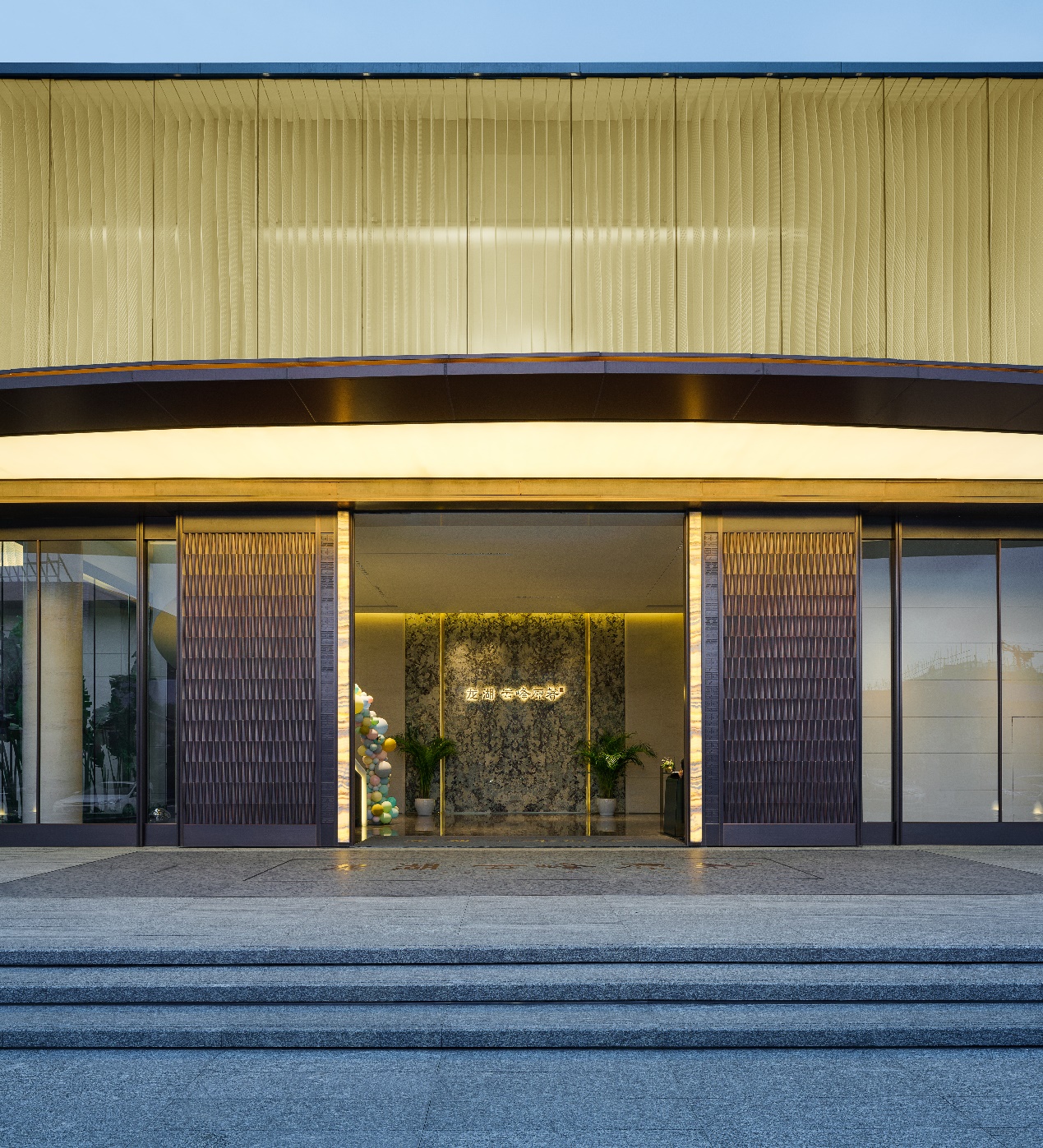 入口難點在于形象展示與視覺焦點的打造。5米高電動銅門,采用和諧的比例關(guān)系,寬與高都以人體比例為基準(zhǔn)設(shè)計。
