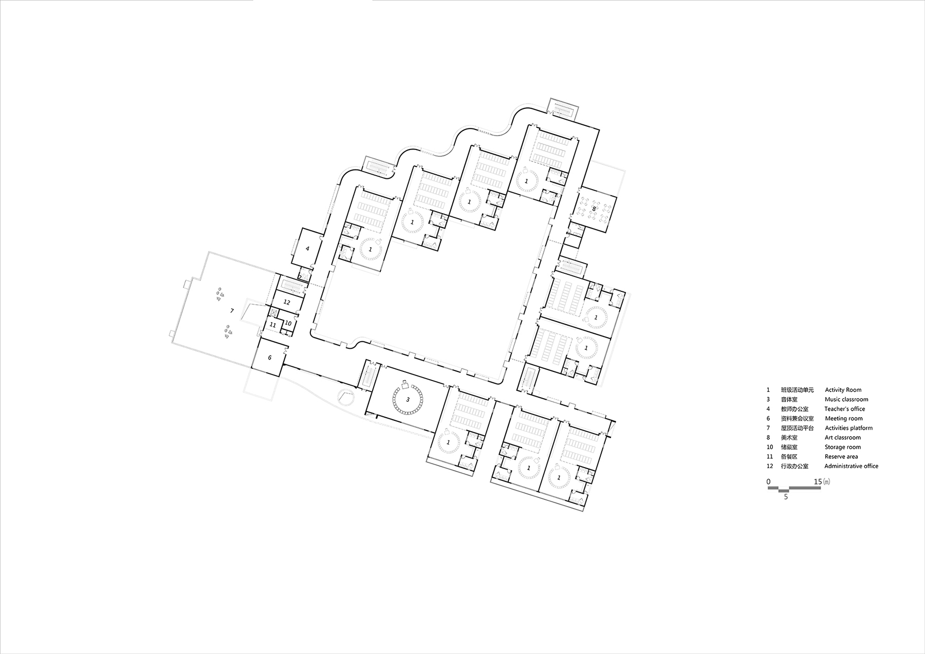 設(shè)計(jì)以“退讓”為核心策略,著力緩解幼兒園與周邊高層的對(duì)峙關(guān)系。建筑體量沿用地展開(kāi),以一種類似“甜甜圈”的形態(tài)圍合成一個(gè)內(nèi)聚性中心庭院,所有班級(jí)單元及輔助用房均圍繞該庭院展開(kāi)。中心庭院為小朋友們提供了一個(gè)安全內(nèi)聚的游戲場(chǎng)地,并為日常全園性集中活動(dòng)提供了空間。