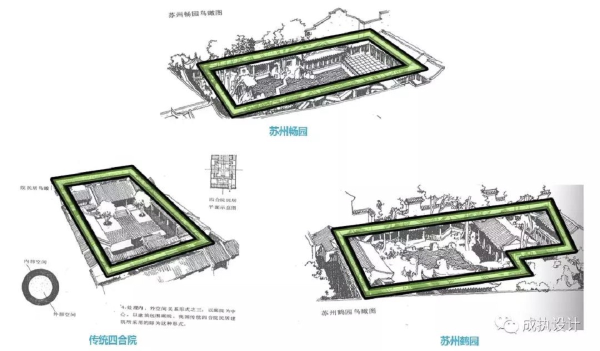 中式園林設(shè)計講究的是“相地合宜,得景隨形”的意境,建筑通過空間劃分、空間布局、主導(dǎo)空間的創(chuàng)造。形成較為內(nèi)向的外部空間,具有很強的內(nèi)向性,人們在此處活動更能體會其空間結(jié)構(gòu)的雅致與棲居環(huán)境的詩意。