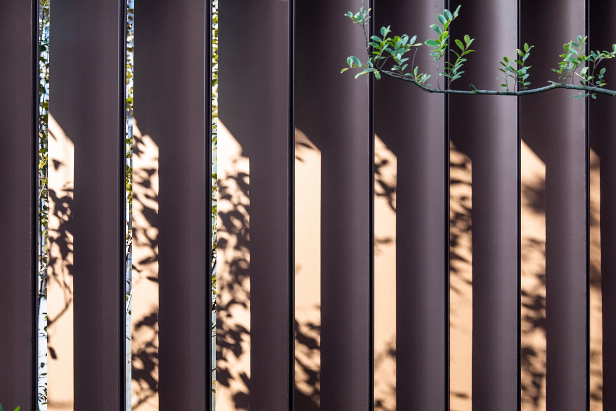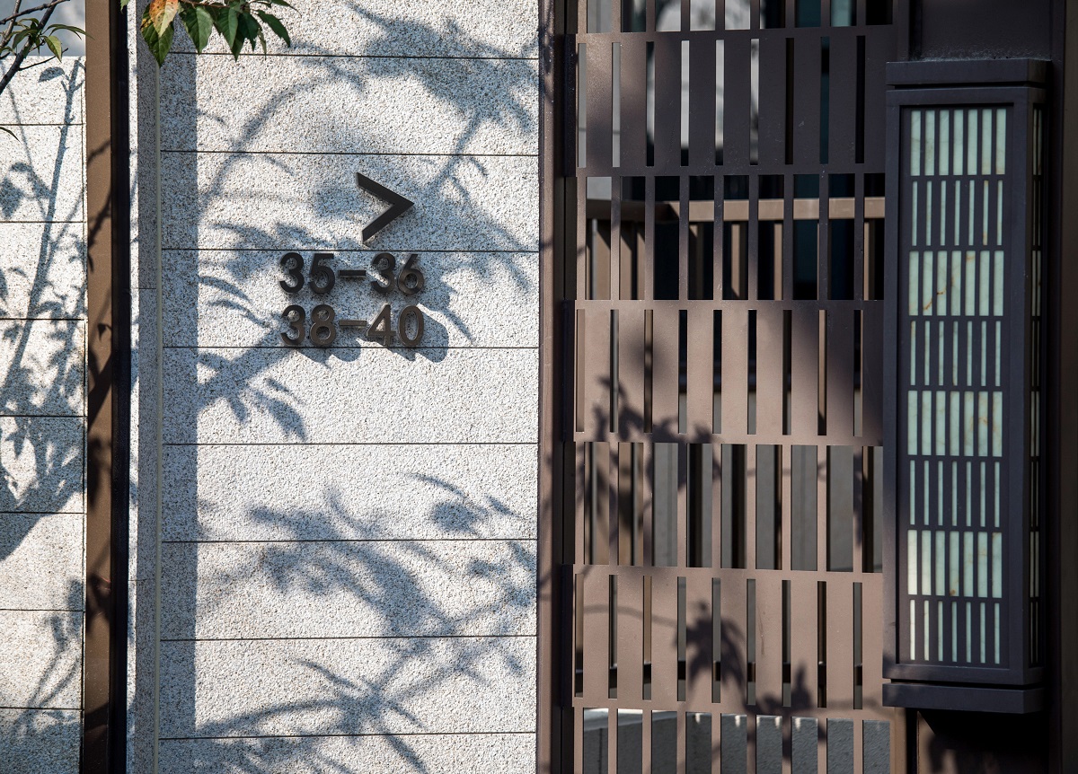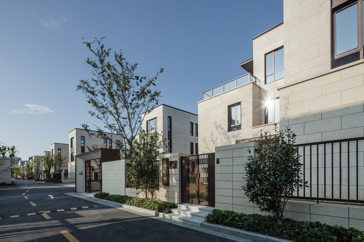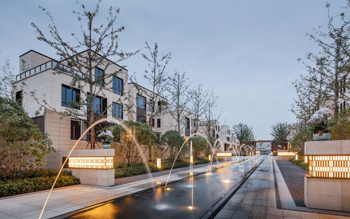 穿過景觀主軸線,在序列的景墻引導(dǎo)下,進入一個低奢優(yōu)雅的環(huán)境中。軸線干凈流暢,貫串始終,精致純粹的線性水景配以“之”字型噴泉,使得該區(qū)充盈著生機與活力。巷道入口以柔和的米黃色作為基調(diào)的景觀門頭,深咖色氟碳漆鋼板格柵裝飾其門扇,尊貴精致且通透。