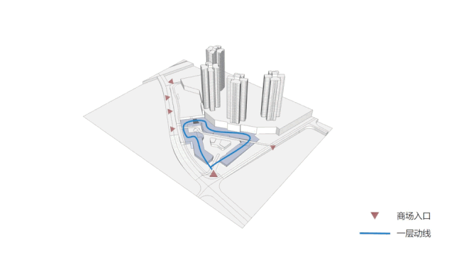 環(huán)形動線的設(shè)計,使城市空間以開放街道的形式滲透入綜合體,建筑主動線與開放街道重合,并形成綜合體內(nèi)部半敞內(nèi)街。也將內(nèi)部步行交通系統(tǒng)融入城市立體步行系統(tǒng),在地下、地面、空中和屋頂多個層面提高綜合體的可達(dá)性。