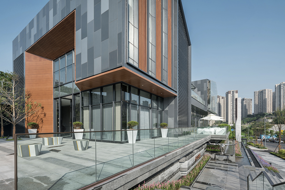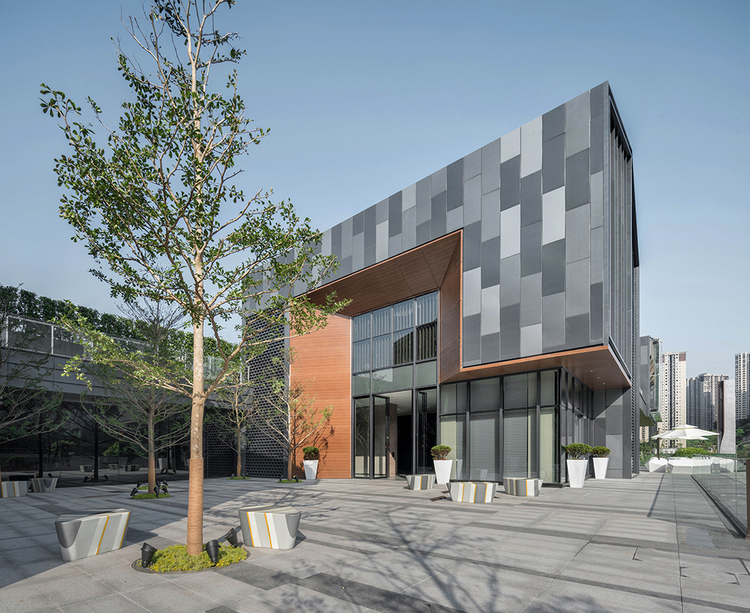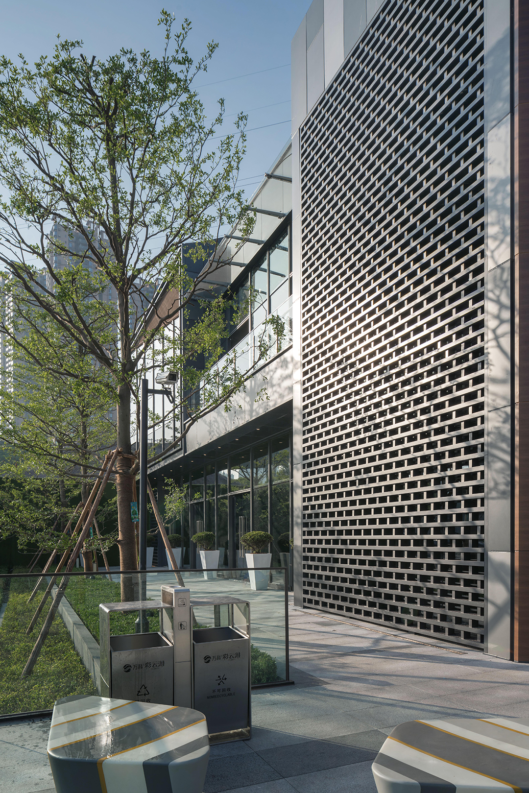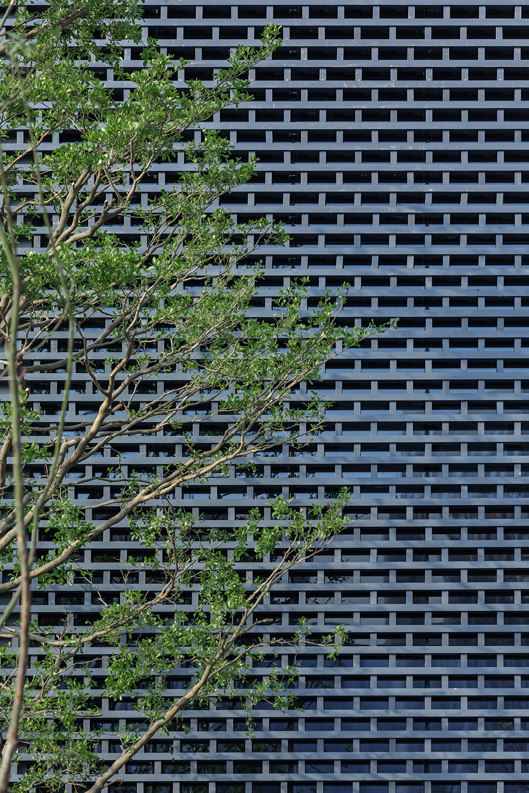 拼色鋁板是森林抽象的表達(dá),模擬各種樹木的穿插與錯落感,有高有低,有深有淺。豐富了立面的材質(zhì)肌理,又能與體量和尺度共棲。