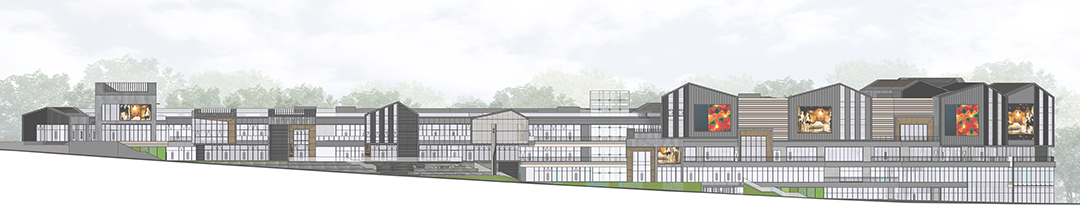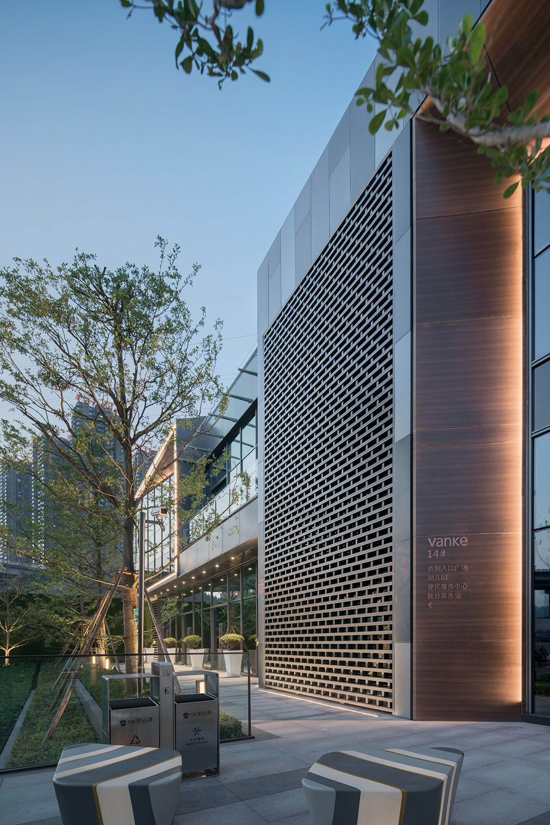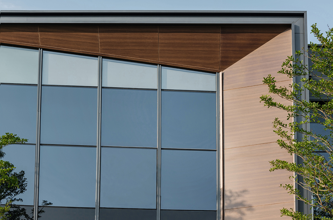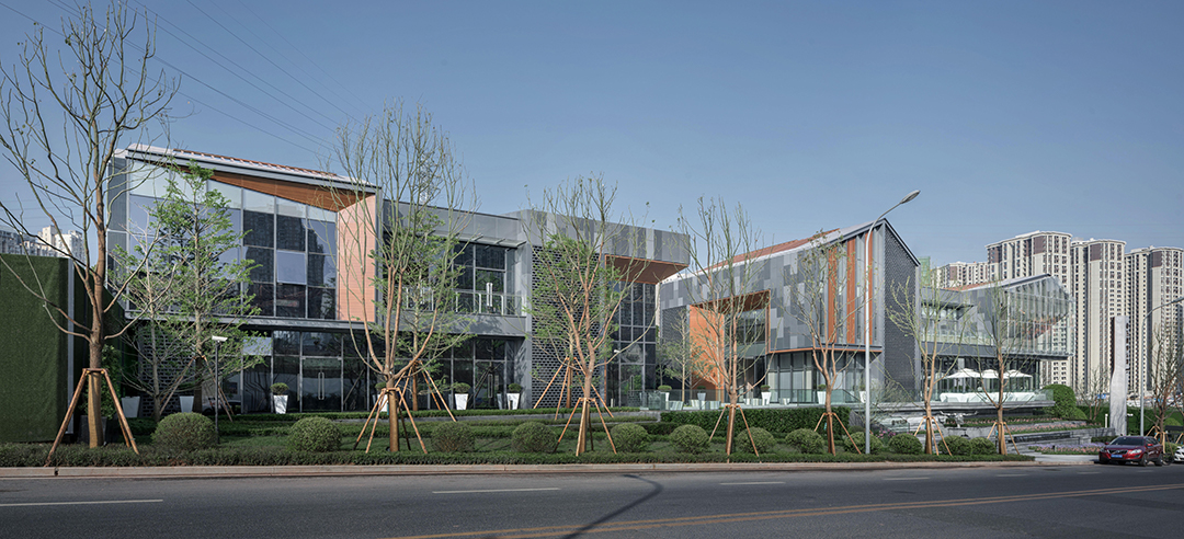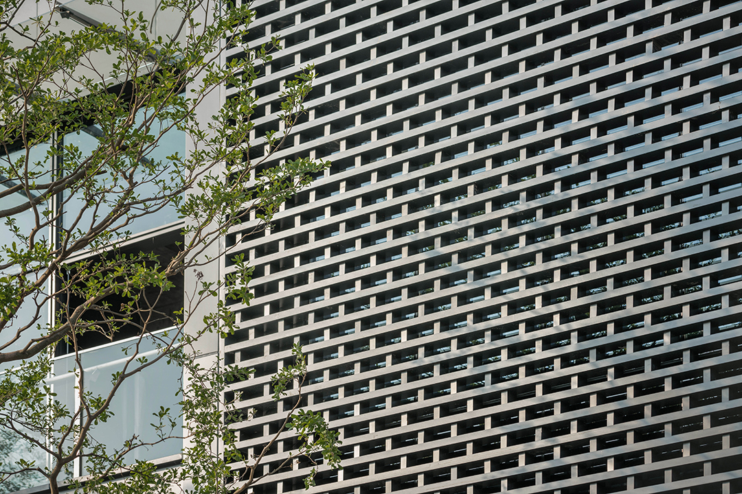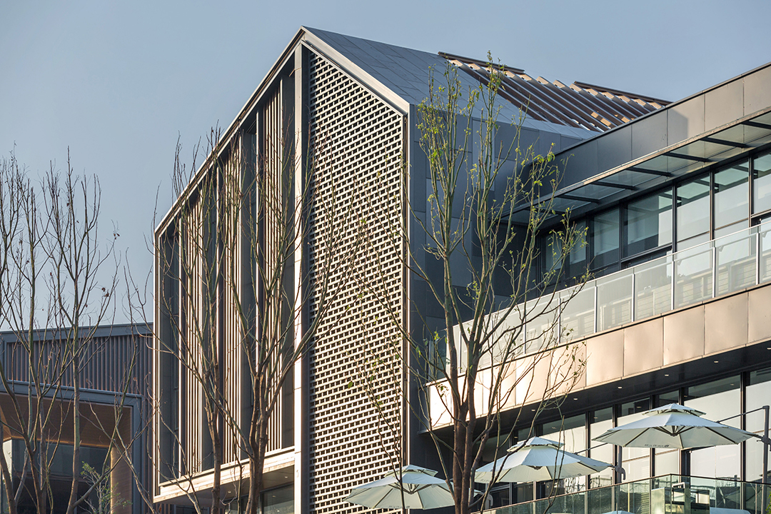 拼色鋁板是森林抽象的表達(dá),模擬各種樹木的穿插與錯落感,有高有低,有深有淺。豐富了立面的材質(zhì)肌理,又能與體量和尺度共棲。