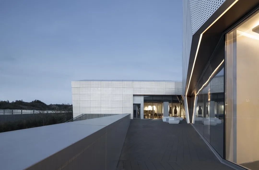 通過對體塊的切割,形成前衛(wèi)現(xiàn)代的建筑形體。大面積穿孔鋁板、仿木紋鋁板和玻璃體塊的結(jié)合,使得整體形象極富張力和工業(yè)美感。