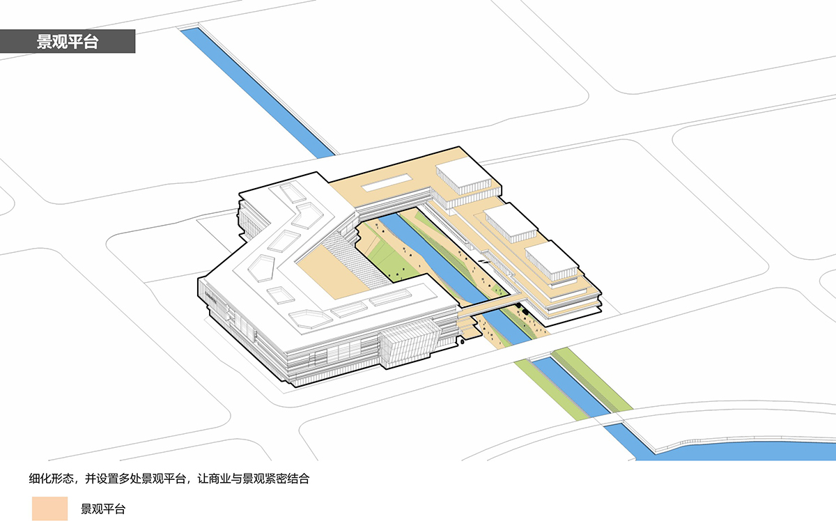 由于天然的水系條件被分為東西兩個(gè)地塊,西側(cè)建筑內(nèi)凹自然形成內(nèi)聚廣場(chǎng),與城市界面留存一定距離,項(xiàng)目為打造一個(gè)城市生活濱水廣場(chǎng)空間,景觀(guān)以水之谷為主題,分別以山(建筑)、苔原(屋頂)、流水(外街)、淺灘(入口廣場(chǎng))、夢(mèng)幻之門(mén)(連橋)、月亮(內(nèi)庭)、水浪(濱水)為元素,通過(guò)景觀(guān)手法串聯(lián)并引導(dǎo)人流進(jìn)入內(nèi)庭,打造以月亮為主題的強(qiáng)IP視覺(jué)匯聚點(diǎn),為商業(yè)提供一個(gè)復(fù)合多功能場(chǎng)地。