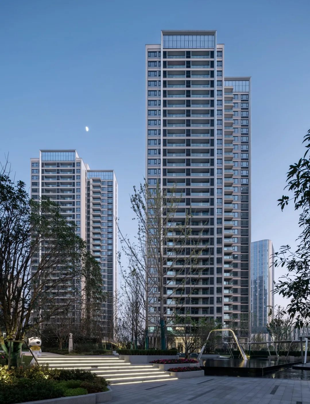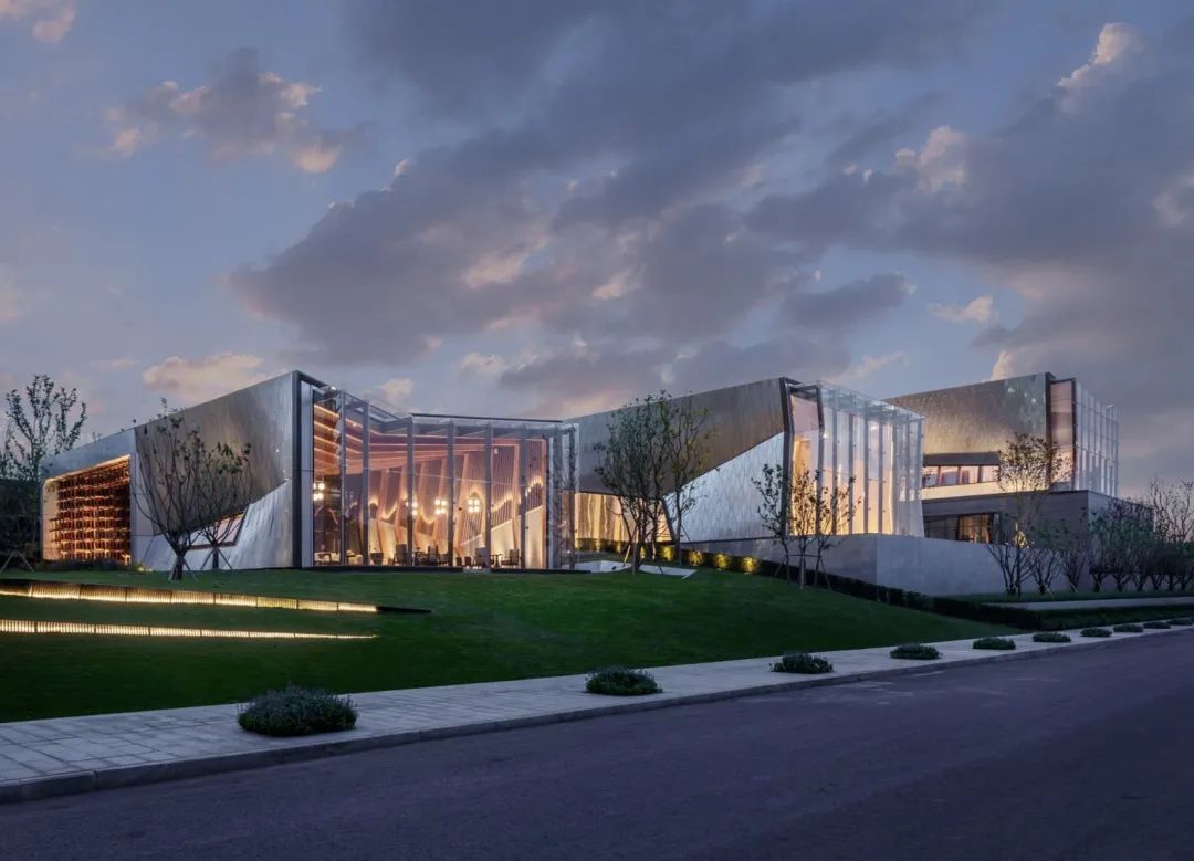 本案延續(xù)照母山肌理加以梳理,詮釋山水意境。在一環(huán)一帶中訴說(shuō)悅?cè)慌c靈氣,隱士之居,呼之即出,秉承“三軸六庭”的空間序列感?!伴T-庭-院”的遞進(jìn)布局,滲透古典園林建筑的“隱逸美學(xué)”。外立面設(shè)計(jì)上引用藏山納水的設(shè)計(jì)理念,形態(tài)上舍棄了傳統(tǒng)住宅的剛正形象,采用弧形立面設(shè)計(jì),將山的剛毅,與水的柔和完美演繹,宛如生長(zhǎng)在照母山上的植物一般,充滿生命力。
