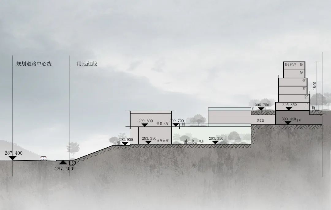 本案依山而筑,場地南北向高差約17米,東西向高差高達35米。基于場地條件,地塊臨嘉瑞大道西側(cè)為體驗中心的最佳且唯一的城市接駁點和人流導入點。利用地形高差,展示區(qū)與城市道路及樣板樓形成高差錯落的山地庭院景觀,鑒于周邊現(xiàn)狀條件的復雜性,我們認為采用“隱”是該項目規(guī)劃設(shè)計策略中主要處理手法。設(shè)計中在前場空間采用半圍合私密庭院來減少城市干道對于住區(qū)的干擾。