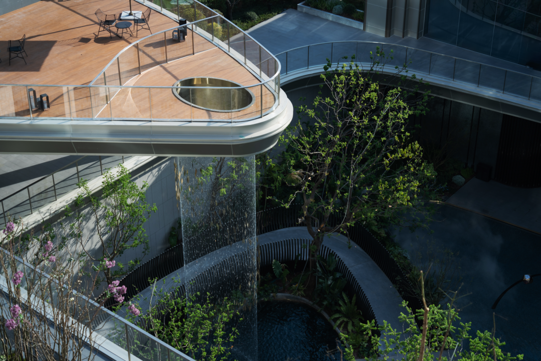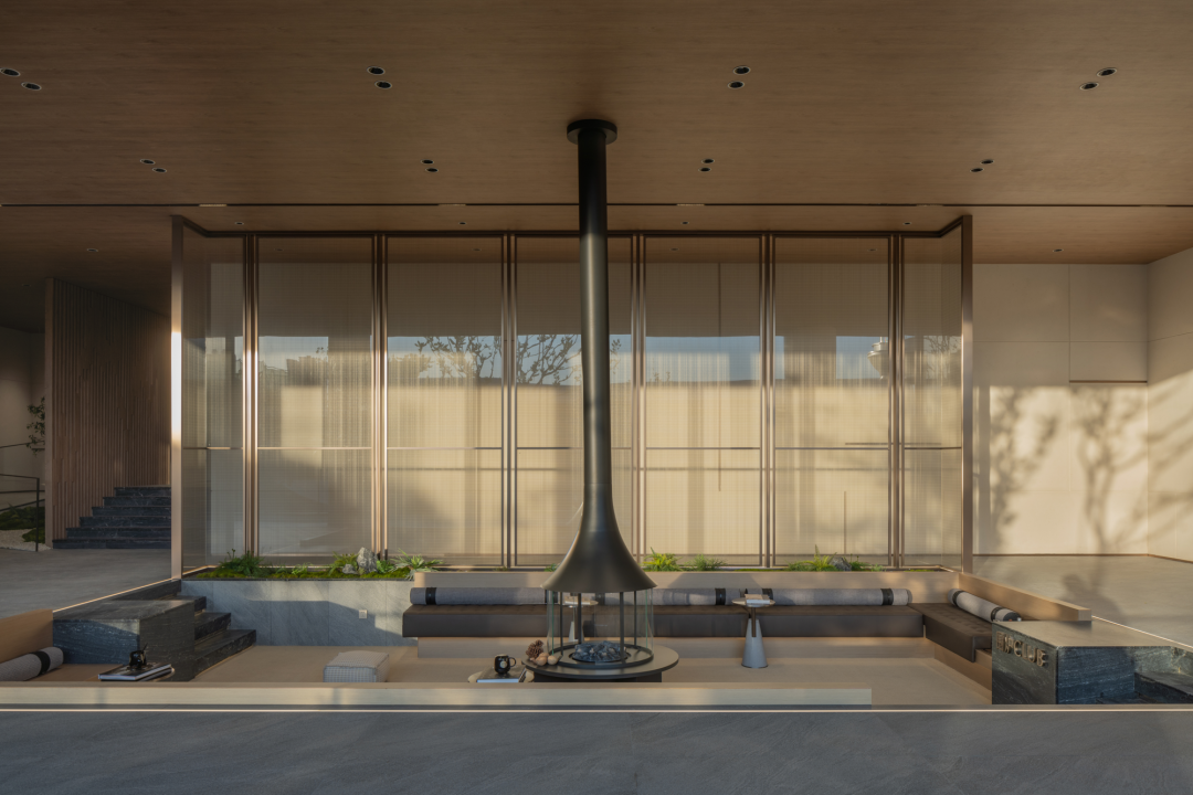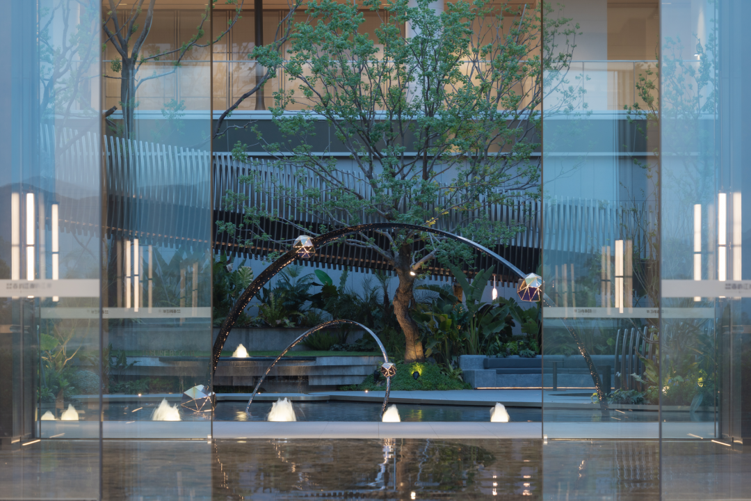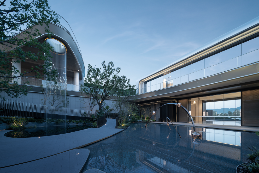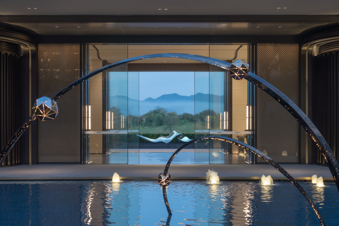 穿過大堂,漂浮、旋轉(zhuǎn)的下沉庭院構(gòu)成了流光水院的后場空間。后場景觀以行星繞日為設(shè)計理念,講述了瑩瑩星體的盤行軌跡。而大堂雖然只是一個建筑空間,但它卻是多個不同的場所。它不僅具有接待的功能性,還承接了內(nèi)外景觀資源,串聯(lián)起遠處的山脈與私密的下沉庭院,從庭院中回看,宛如一幅水墨畫般映入眼簾。