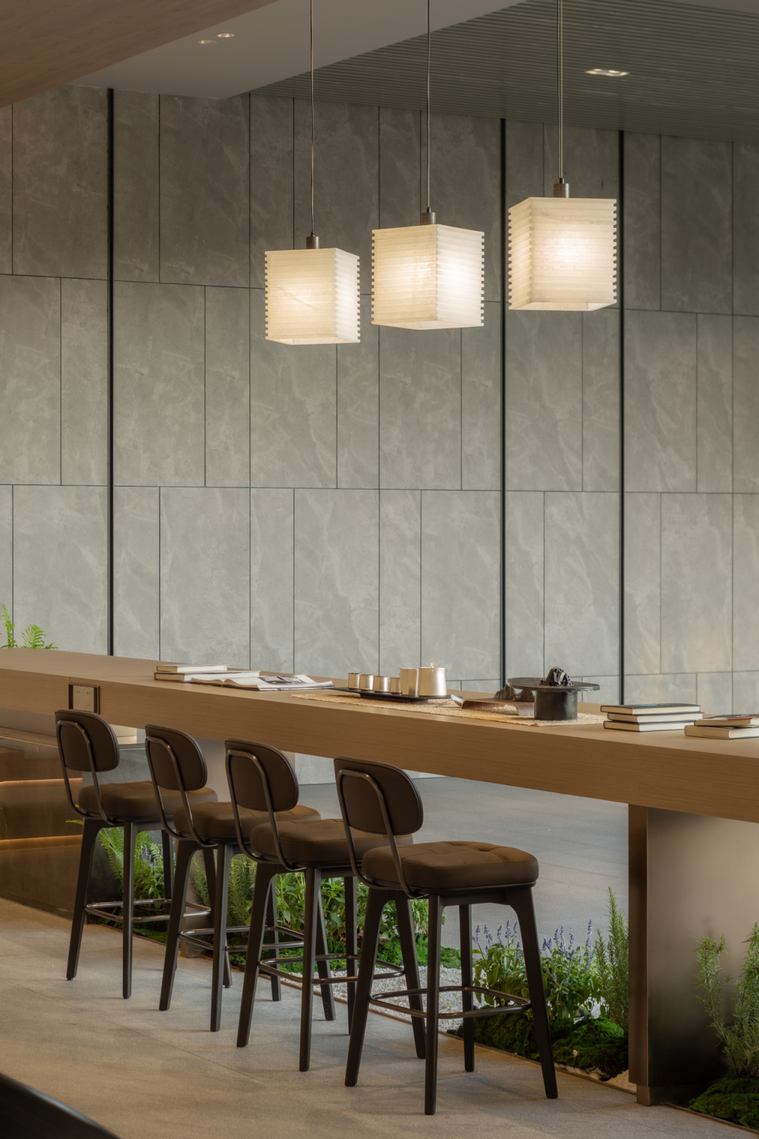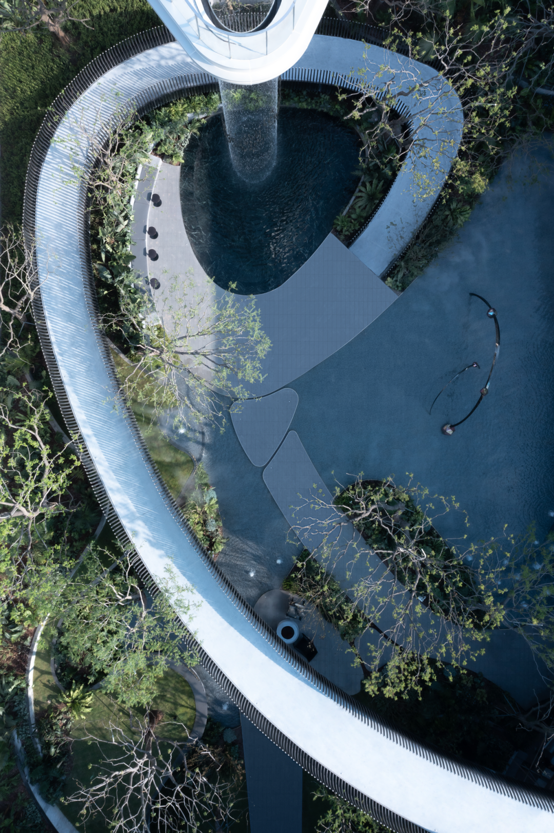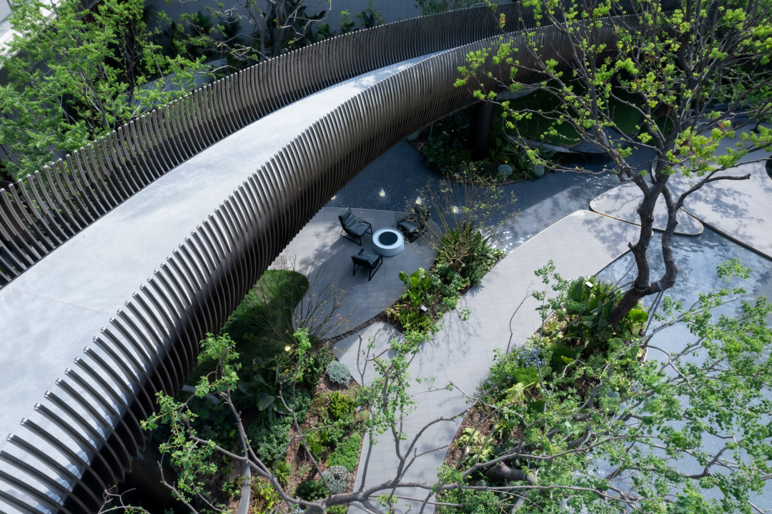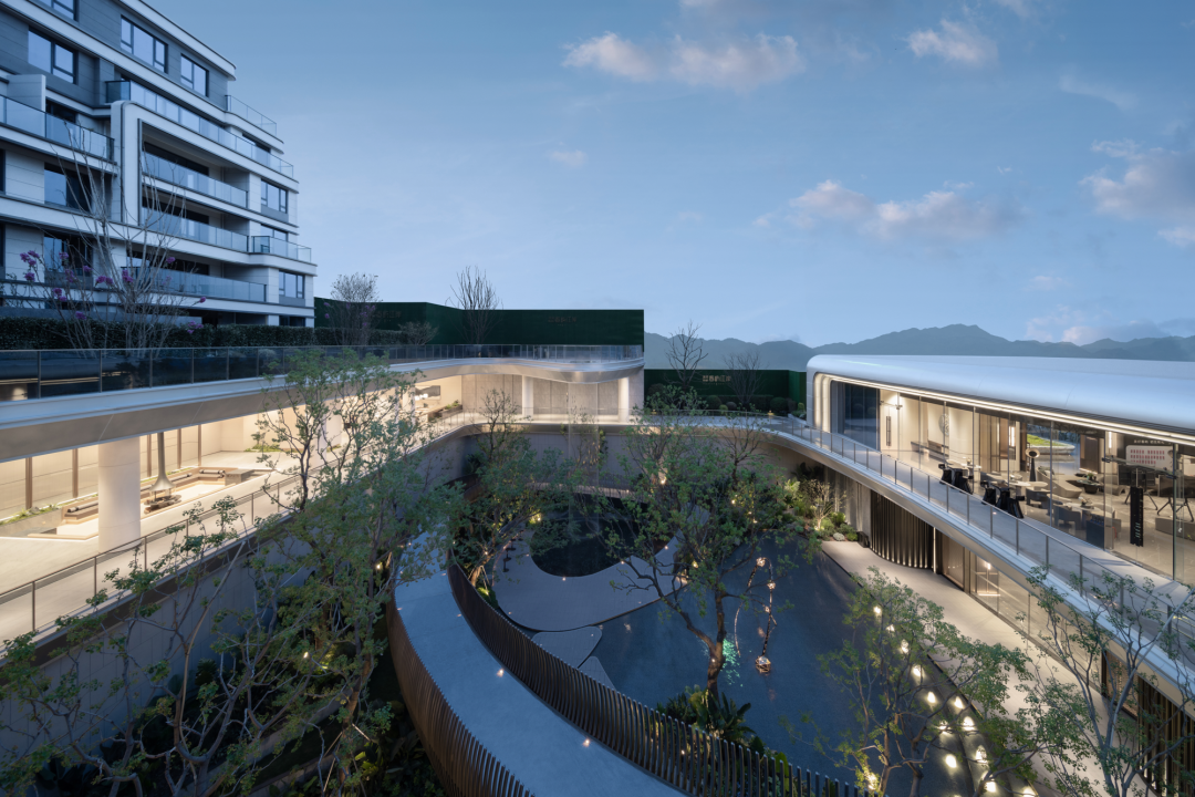 穿過大堂,漂浮、旋轉(zhuǎn)的下沉庭院構(gòu)成了流光水院的后場空間。后場景觀以行星繞日為設(shè)計理念,講述了瑩瑩星體的盤行軌跡。而大堂雖然只是一個建筑空間,但它卻是多個不同的場所。它不僅具有接待的功能性,還承接了內(nèi)外景觀資源,串聯(lián)起遠處的山脈與私密的下沉庭院,從庭院中回看,宛如一幅水墨畫般映入眼簾。