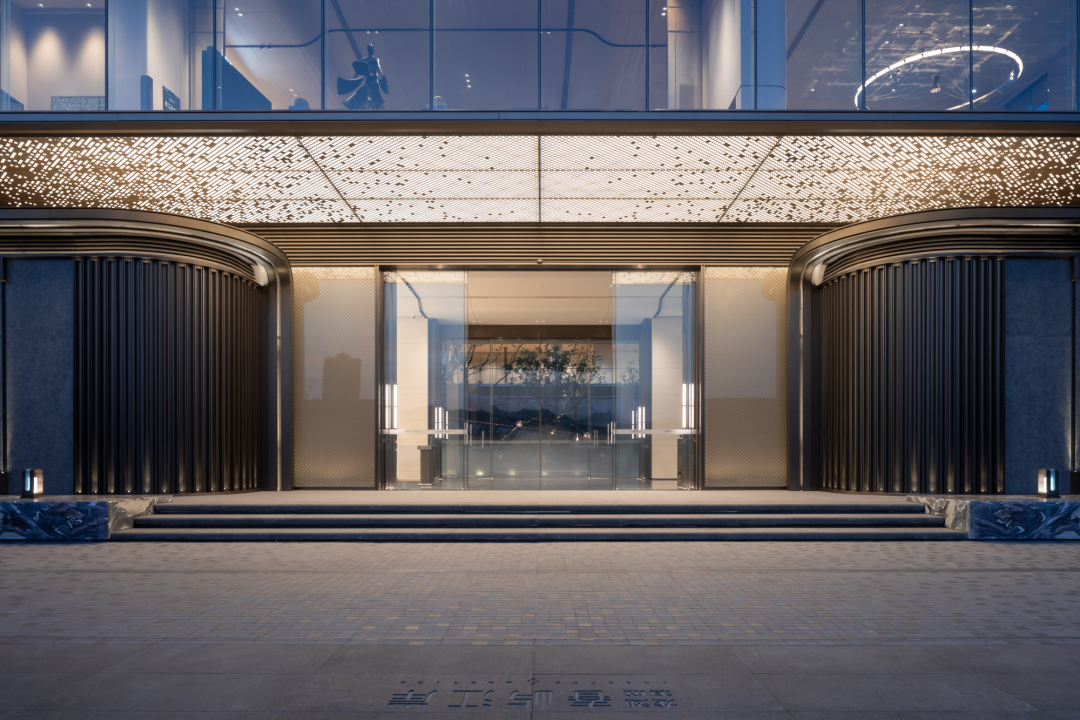 建筑體量的構(gòu)成關(guān)系則通過外圍香檳金及銀色鋁板線條和中間大面積超白玻體量之間形成一種包絡(luò)關(guān)系,同時又發(fā)生了一定程度的內(nèi)外收分,入口側(cè)則出現(xiàn)了干凈純粹玻璃盒子漂浮于基地之上的輕盈靈動空間效果。