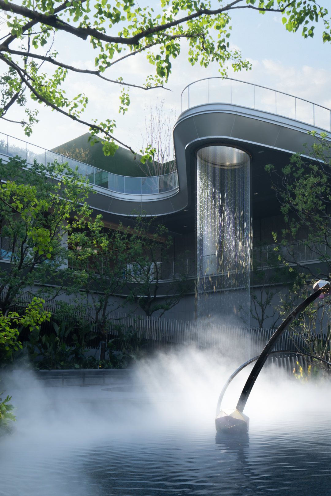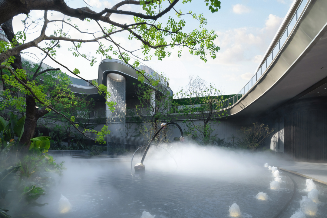 立體浮橋,透光織印,連橫交縱。潺潺的流水,從空中墜落,如銀河繁星般灑落下來。喬灌木的綠意點綴,人行廊橋穿梭其中,一幅自然的畫卷油然而生,讓人們身心愉悅,勾起探索之欲。