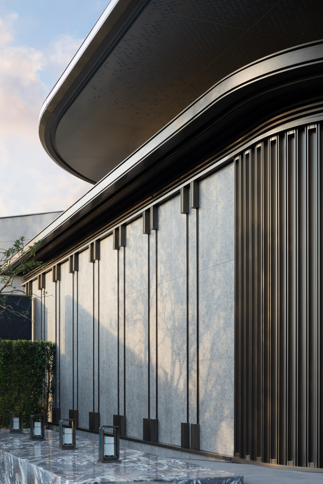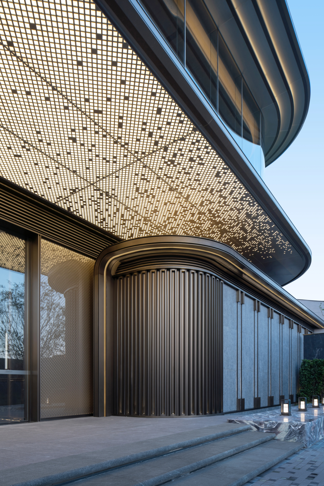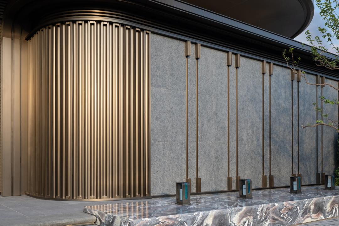入口立面造型相比于單純的無銹鋼的材質(zhì),石材與無銹鋼相結(jié)合,利用無銹鋼作為條形格柵,使其更精致,呈現(xiàn)效果更均質(zhì)。幕墻頂部的有懸挑近兩米,雙曲面弧形收口處理,也是細節(jié)難點。