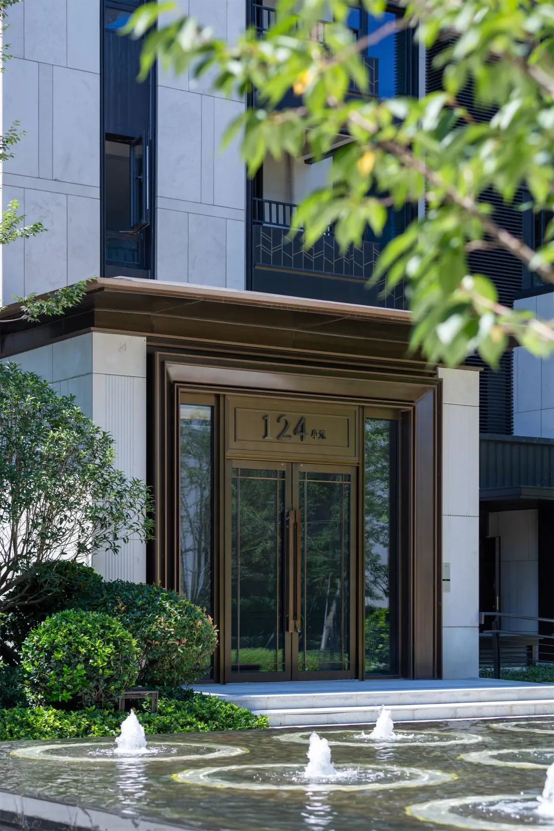 入戶前或井字涌泉,或規(guī)整花陣構(gòu)成具有儀式感的小廣場,花香四溢輕踏漫步道,放松歸家之人一天疲憊的心情。入戶大堂設(shè)計承襲整體典雅的新中式風(fēng)格,但更為簡約,尺度更加親切。
