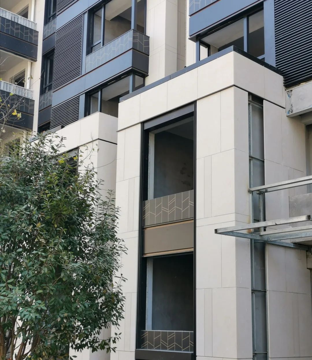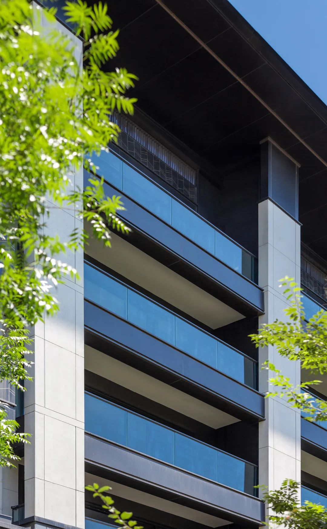 建筑細部融入了予以現(xiàn)代化轉(zhuǎn)譯的中式元素,窗臺裝飾以簡單別致的花紋,不喧賓奪主而獨具匠心。采用多種材質(zhì)弱化尺度,減弱深色帶來的壓迫感,香檳金色予以點綴。