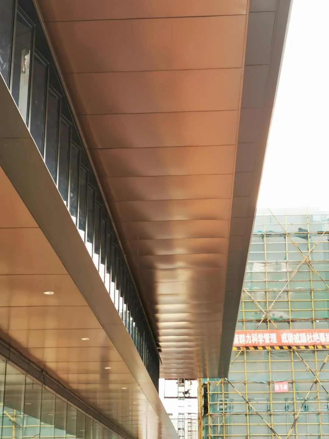 如入境“府院”區(qū)域建筑立面貼磚未采用常規(guī)橫向的方式,而是采用了竹節(jié)式的拼貼,與色澤古雅的古銅色金屬構(gòu)架和不銹鋼拉絲面相配,輔以LED黃色柔性燈帶,呈現(xiàn)匠心精筑的美好人居。雖棄繁就簡,亦不忘琢磨細節(jié)。