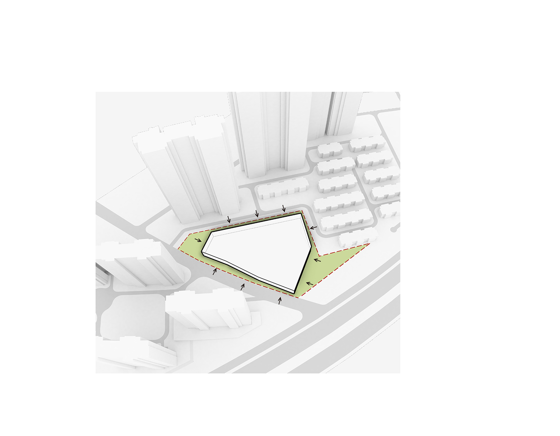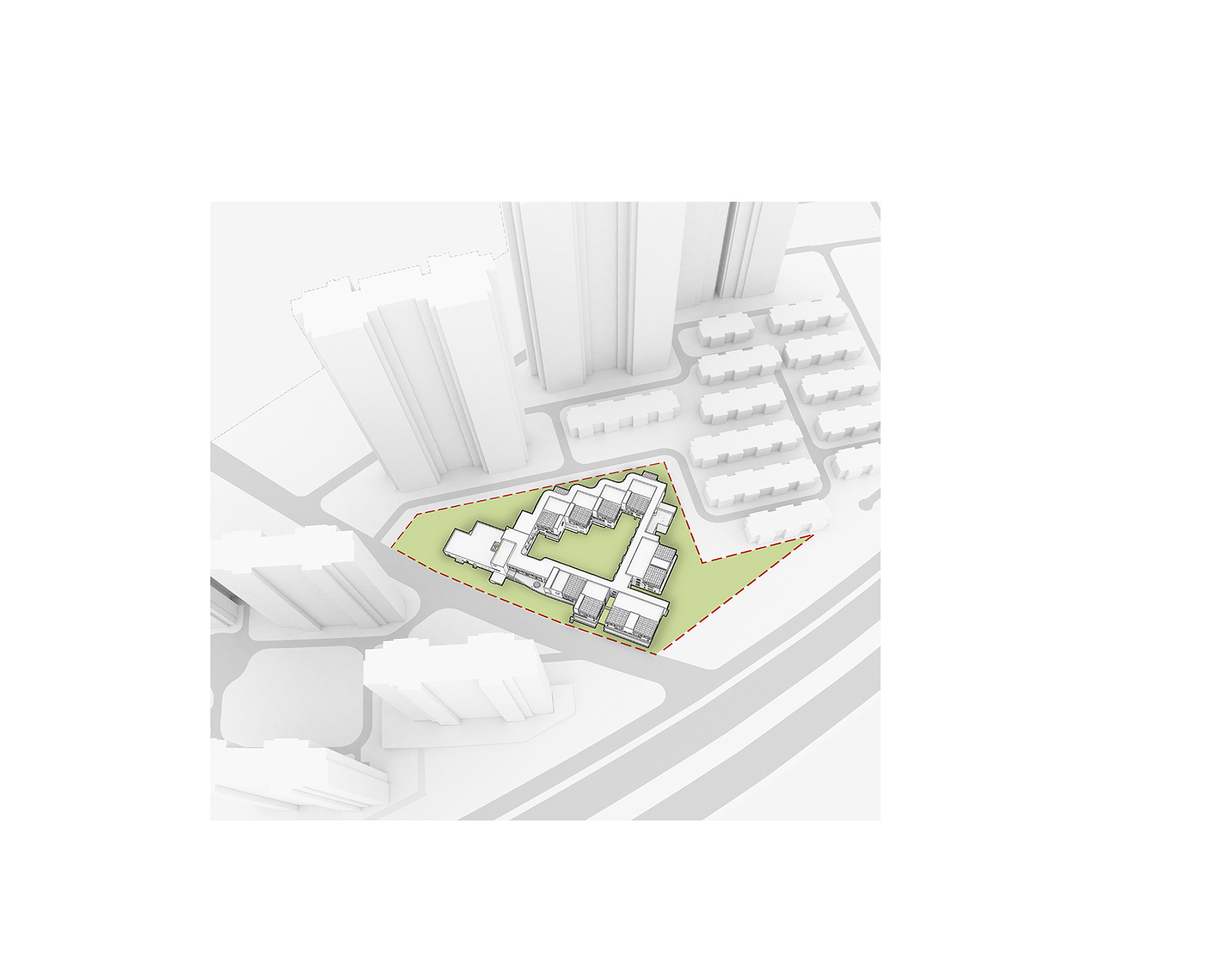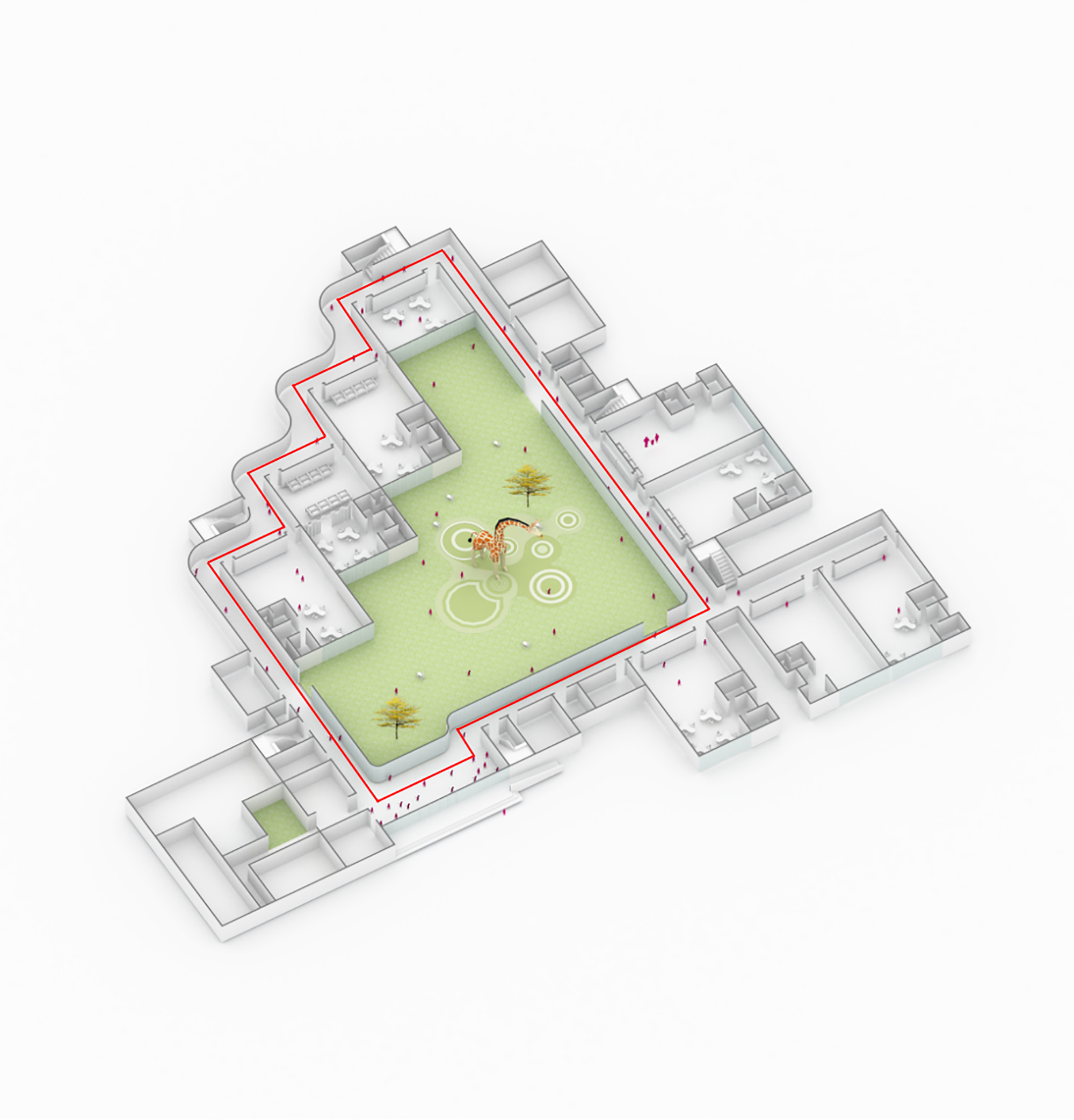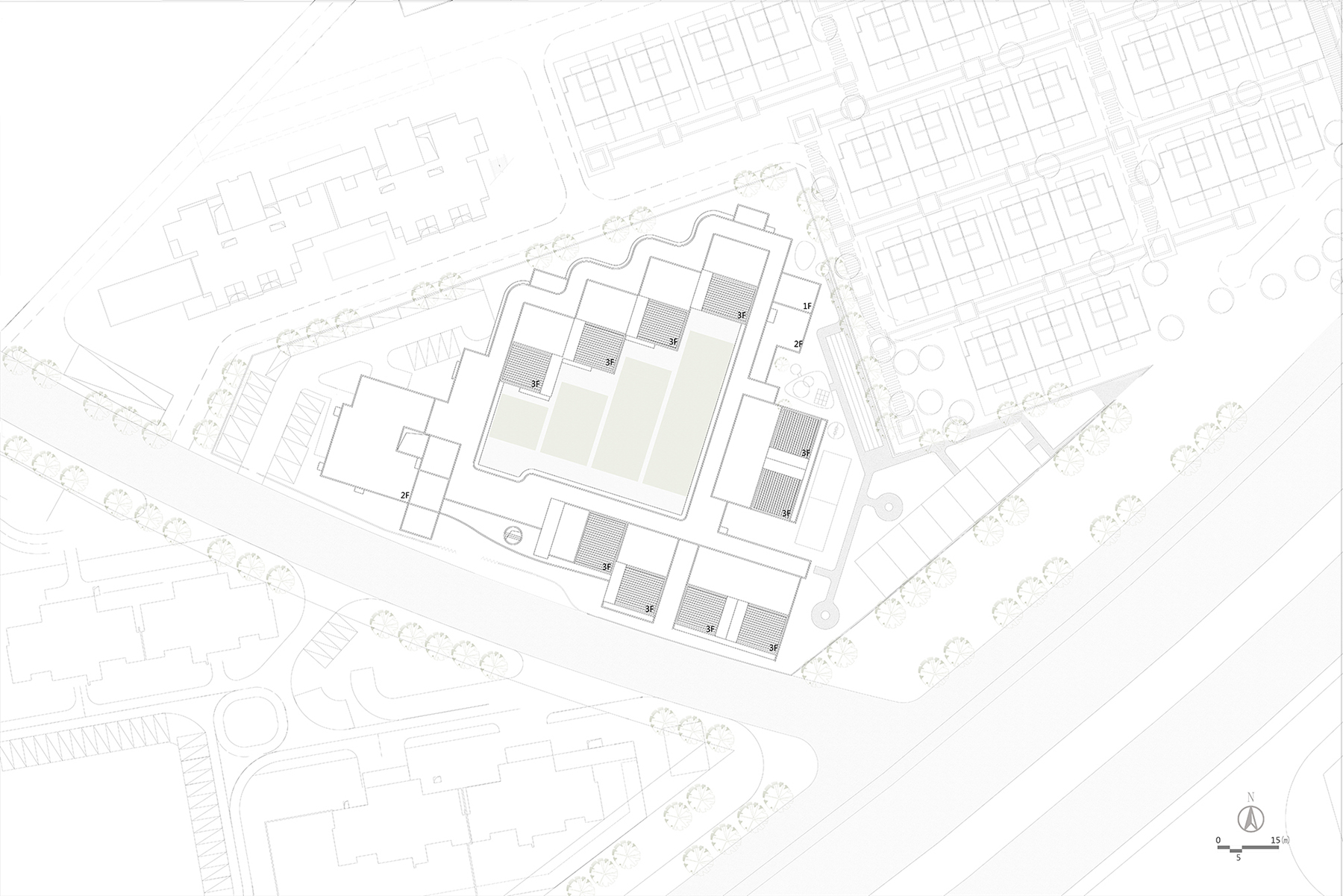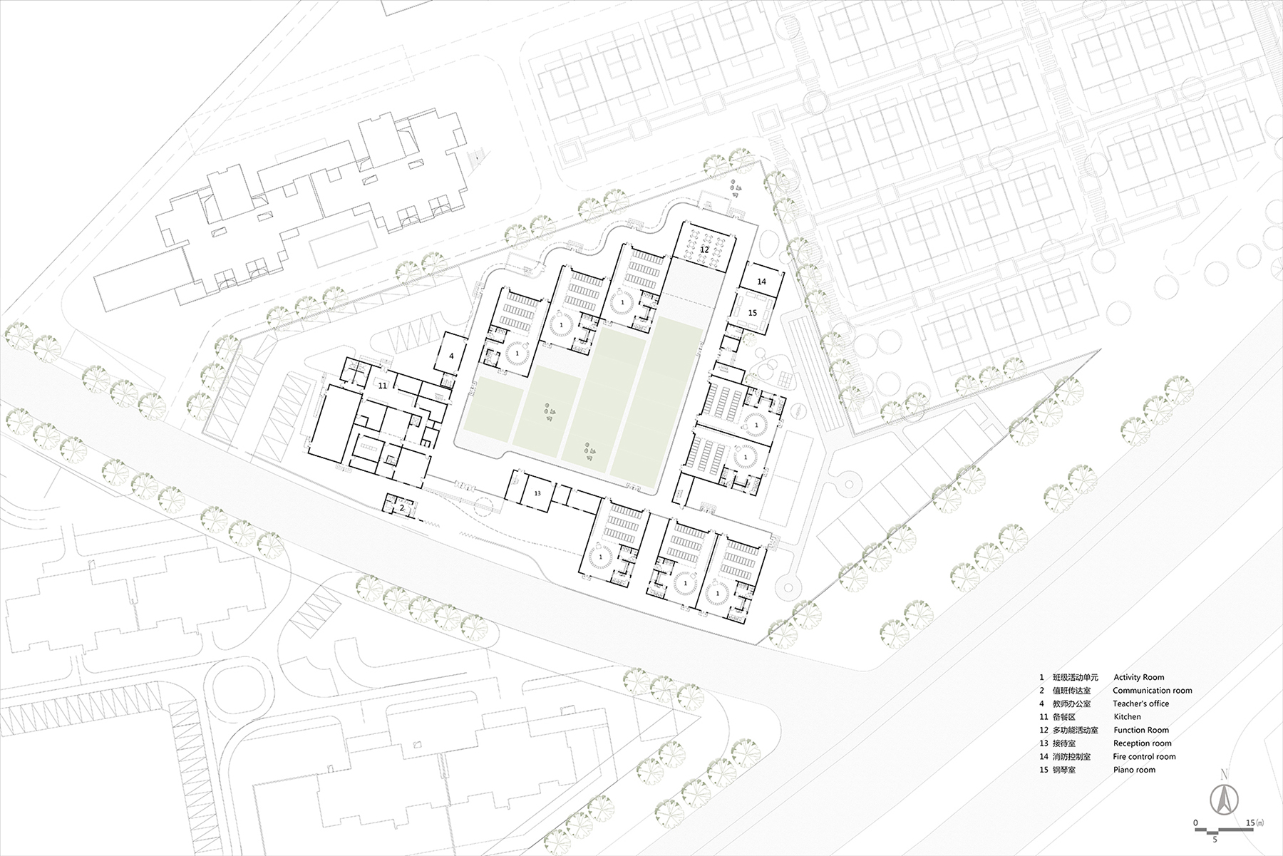 設(shè)計(jì)以“退讓”為核心策略,著力緩解幼兒園與周邊高層的對(duì)峙關(guān)系。建筑體量沿用地展開(kāi),以一種類似“甜甜圈”的形態(tài)圍合成一個(gè)內(nèi)聚性中心庭院,所有班級(jí)單元及輔助用房均圍繞該庭院展開(kāi)。中心庭院為小朋友們提供了一個(gè)安全內(nèi)聚的游戲場(chǎng)地,并為日常全園性集中活動(dòng)提供了空間。
