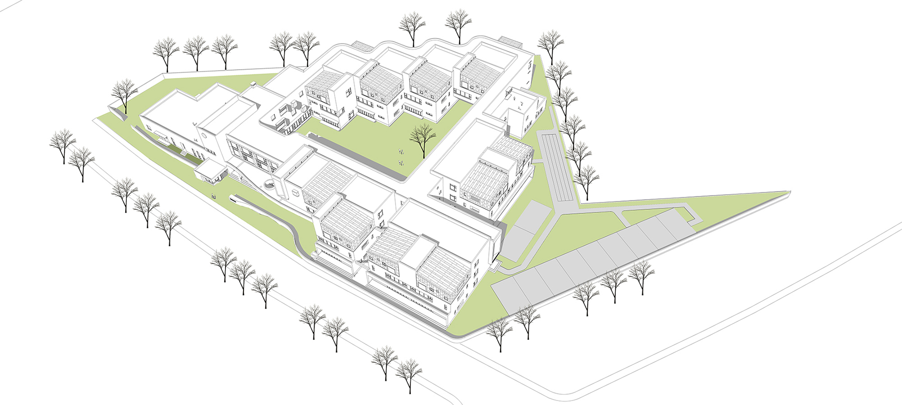 標(biāo)準(zhǔn)班級(jí)單元采用了形體簡(jiǎn)潔的單坡屋頂,坡屋頂對(duì)于小朋友們來(lái)說(shuō)是就是“房子”或“家”最典型也是最抽象的表達(dá),它是一種建筑符號(hào),也是一種情感媒介。坡屋頂不同的組合方式形成了豐富的建筑立面效果,也為周邊高層住戶提供了有趣的園區(qū)“第五立面”。