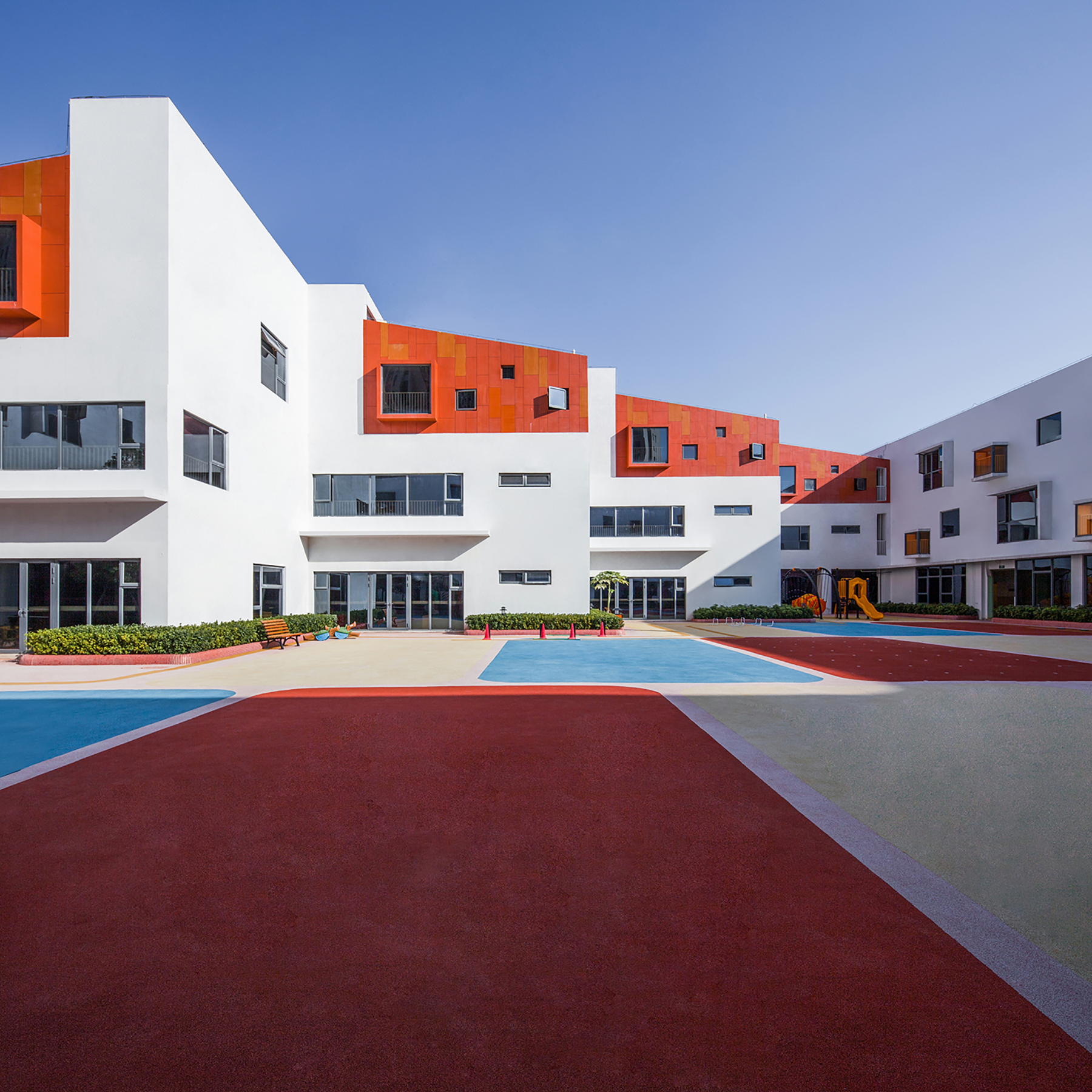 作為商業(yè)開(kāi)發(fā)項(xiàng)目的配建幼兒園,在建設(shè)成本和設(shè)計(jì)管理上都有它天然的局限性。設(shè)計(jì)師力求通過(guò)樸素的設(shè)計(jì)語(yǔ)言,以有趣的空間來(lái)組織功能,以明確的體量來(lái)塑造光影,在限制性設(shè)計(jì)條件下用心營(yíng)造一個(gè)“不受限”的兒童樂(lè)園。