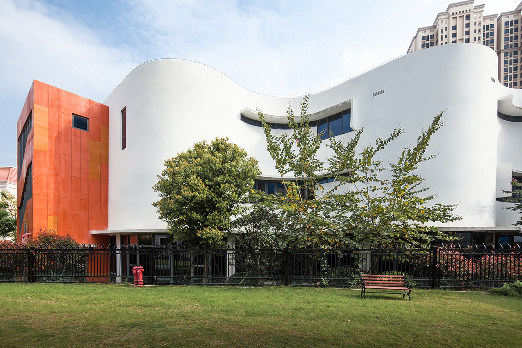 為減少對(duì)北側(cè)住宅的壓力,幼兒園北側(cè)的建筑體量沿界以“波浪”起伏的曲面形態(tài)呈現(xiàn),塑造出一種有趣的緩沖界面,為緊鄰的低層住戶提供了表情生動(dòng)的對(duì)視景觀, 同時(shí)也為建筑內(nèi)部塑造了一段富有戲劇性的圍廊空間。