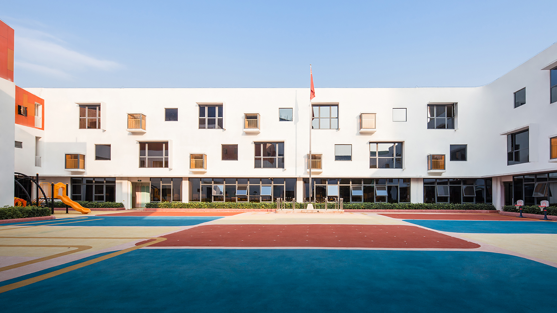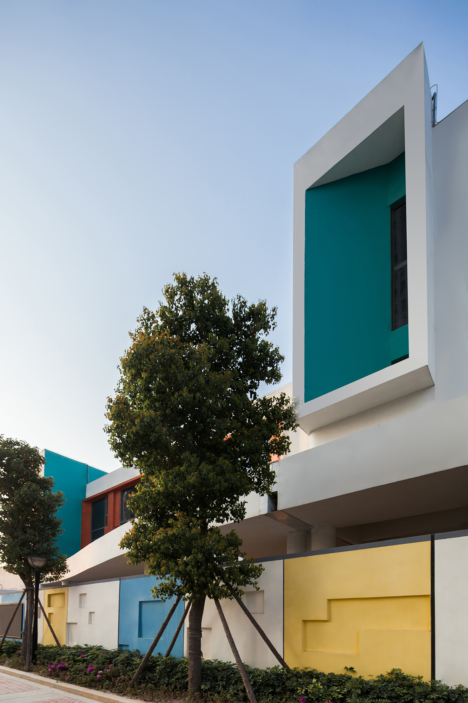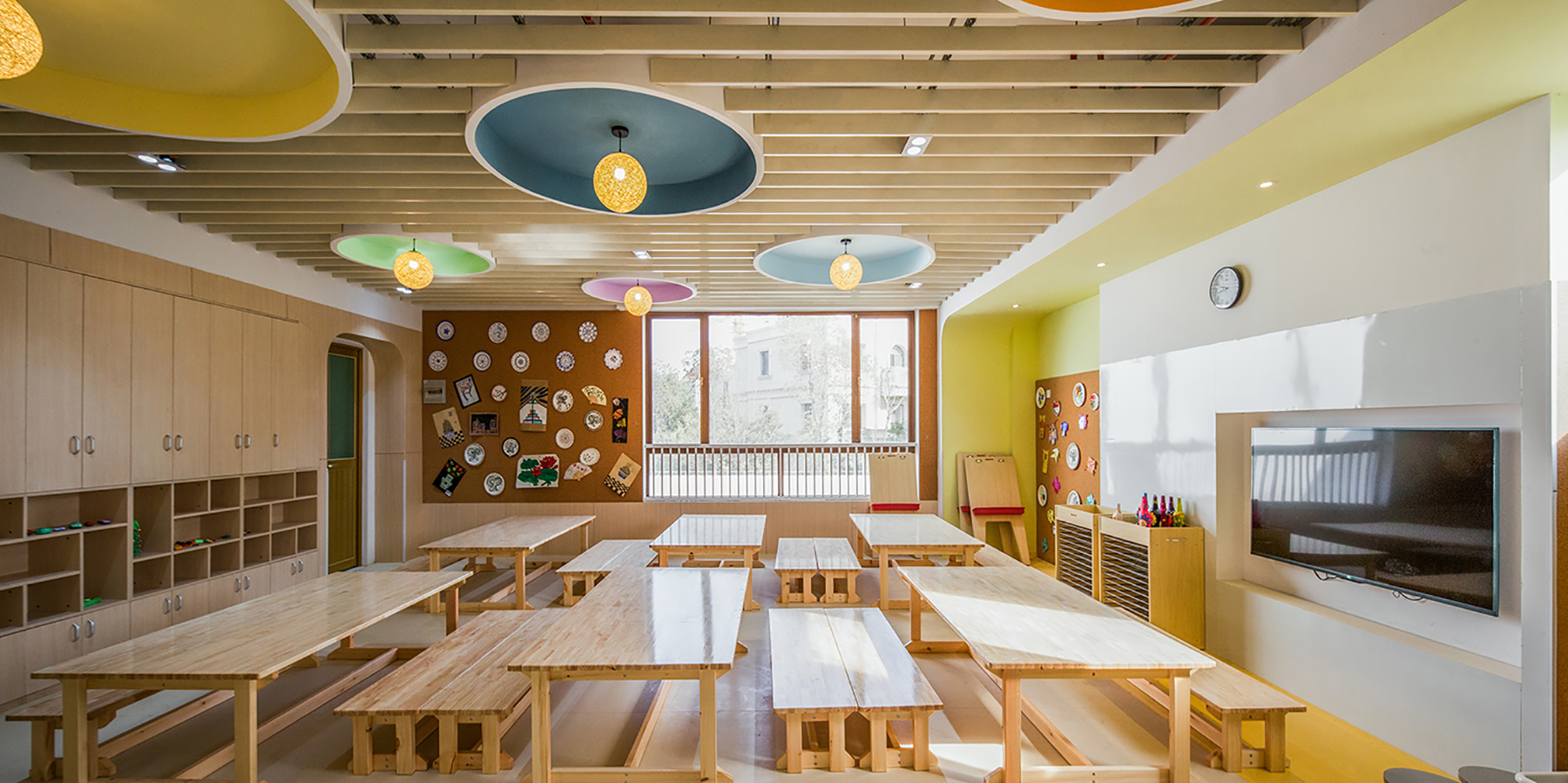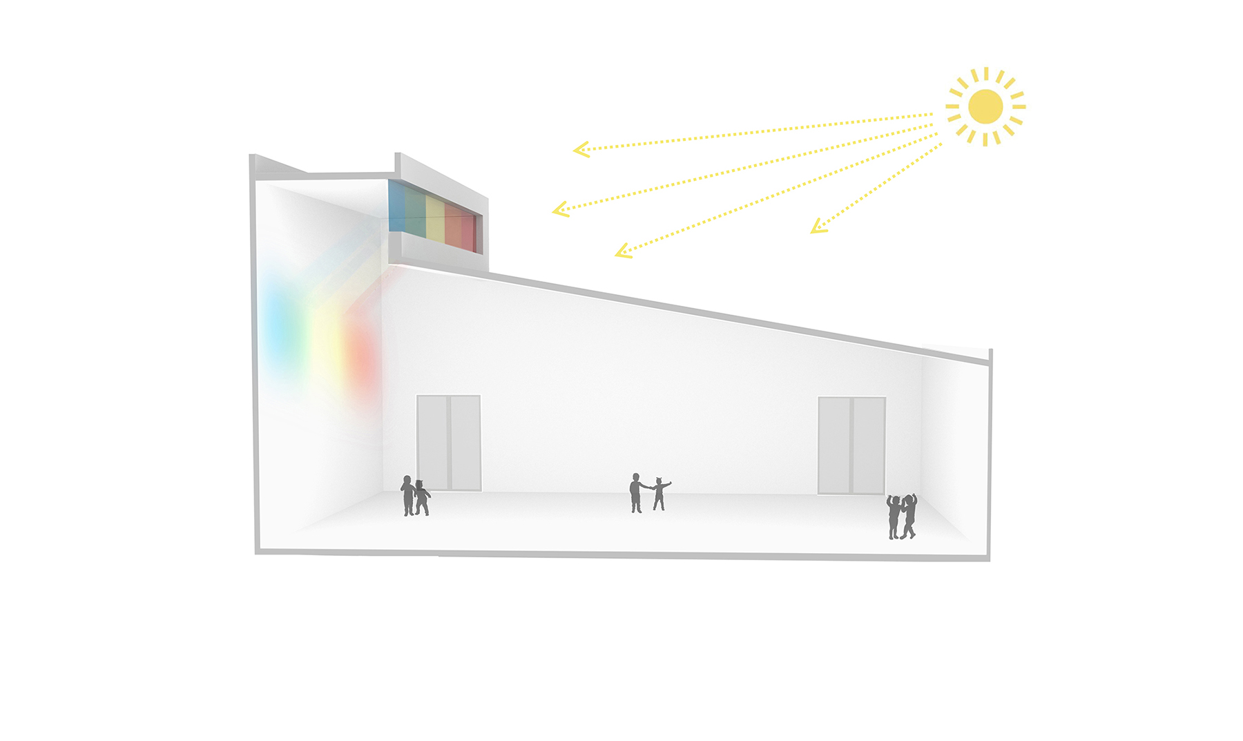 設(shè)計(jì)師給三層的每一個(gè)班級(jí)單元都設(shè)置了彩色天窗,期望每天早晨的陽(yáng)光透過(guò)天窗投射到活動(dòng)室的白色墻面上,產(chǎn)生如七色彩虹般的光影效果。這面墻將成為小朋友們的天然調(diào)色板,從早晨到傍晚,隨著時(shí)間變幻出不同的色彩和圖案。