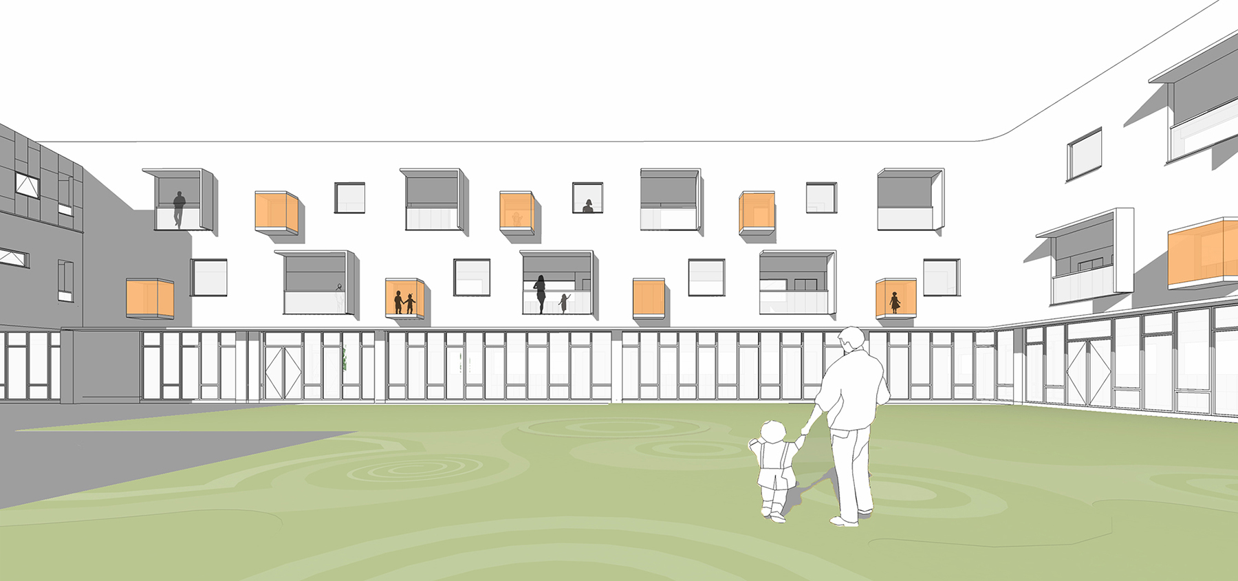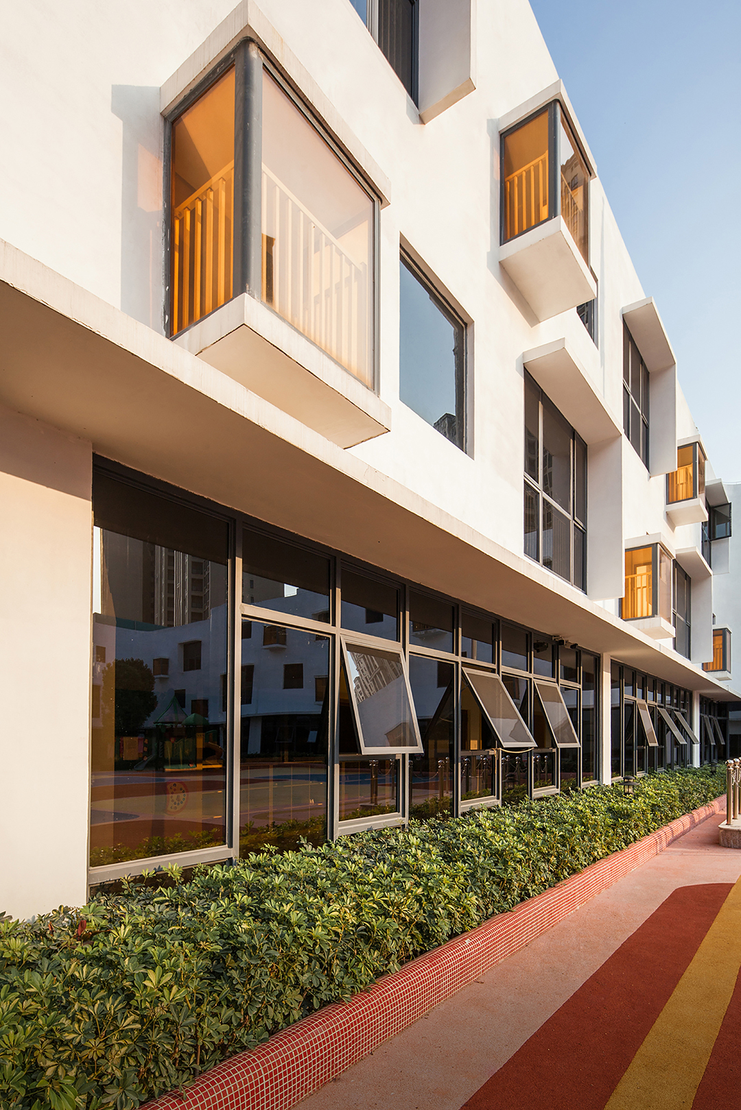 朝著中心庭院的環(huán)廊外墻,設(shè)置了三種不同尺度的洞口,對(duì)應(yīng)不同的活動(dòng)場(chǎng)景,洞口尺寸分別為2700*2700——落地窗洞,老師和小朋友都能通過(guò)這個(gè)窗洞看到中心庭院; 1800*1800——距地900的窗洞,老師能往外看到庭院,小朋友能往上看到天空;1500*1500——進(jìn)深900的落地凸窗,大人不便進(jìn)入,它是小朋友們的私屬小屋,三兩個(gè)小伙伴可以躲在“小屋”里分享彼此的小秘密,或者與走廊上的其他小朋友玩捉迷藏的游戲。