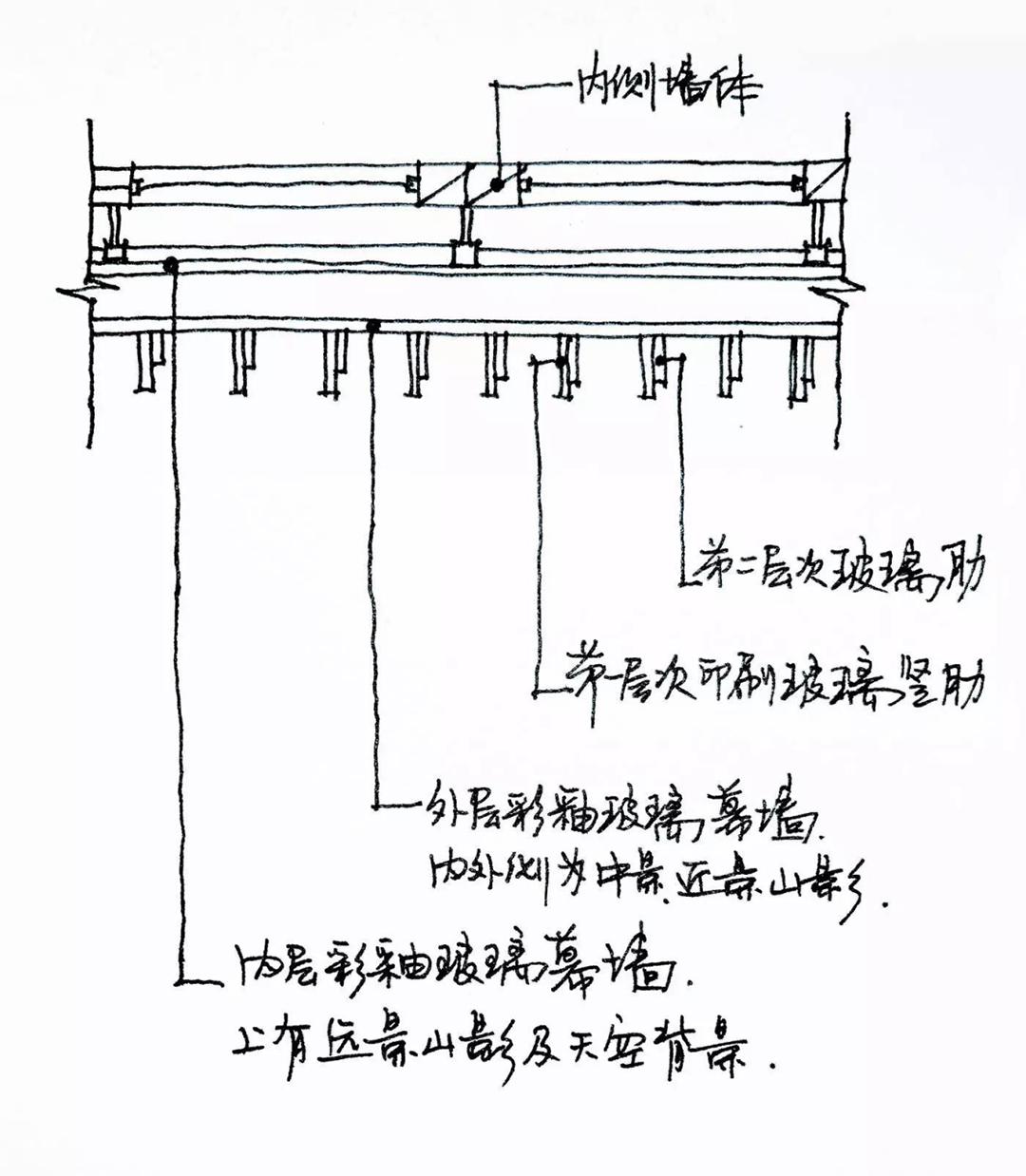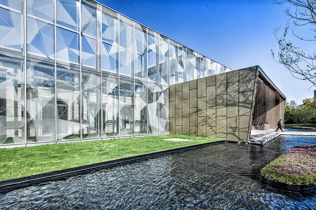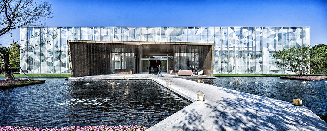 在極短時(shí)間里和做工上的難度,對(duì)于極小尺寸的把控,橫隱豎顯的幕墻體系,營(yíng)造景觀層次和空間厚度的效果。利用玻璃材料的反射和透射,結(jié)合數(shù)碼彩釉技術(shù),共同打造一個(gè)邊界模糊、層次流轉(zhuǎn)的含蓄形態(tài)。