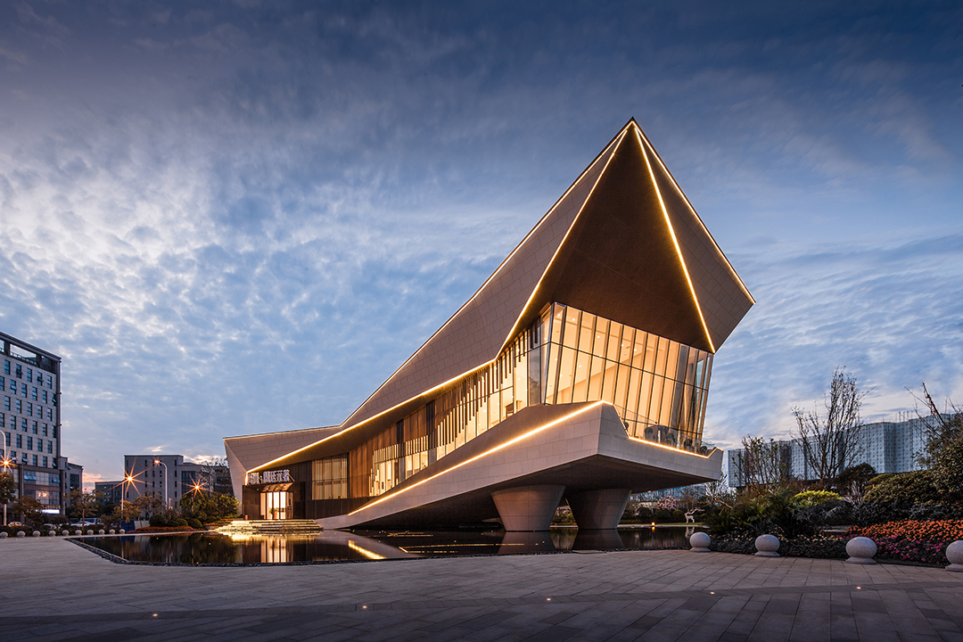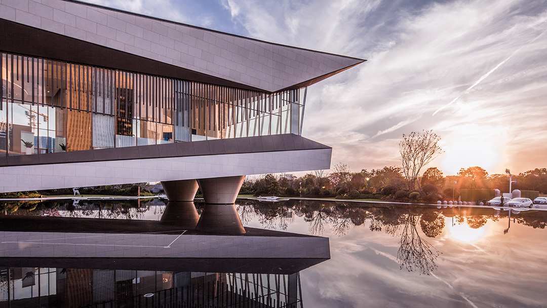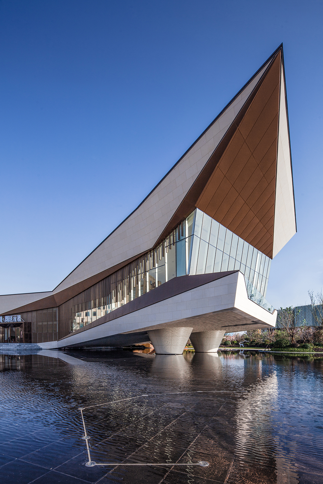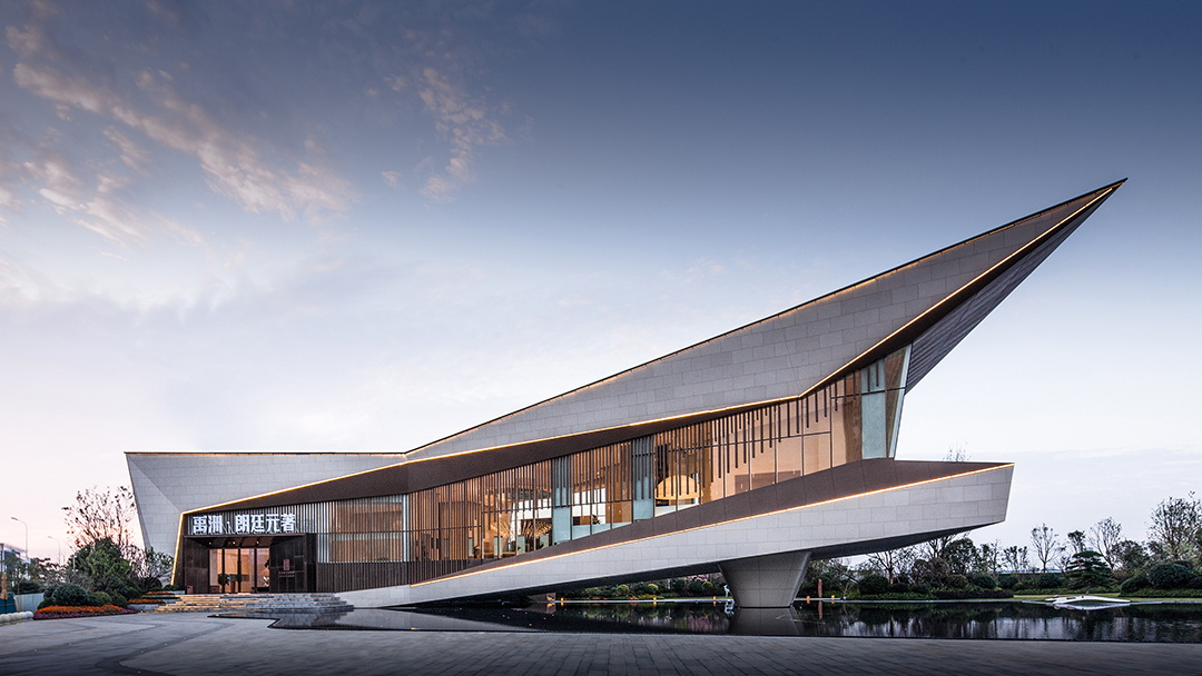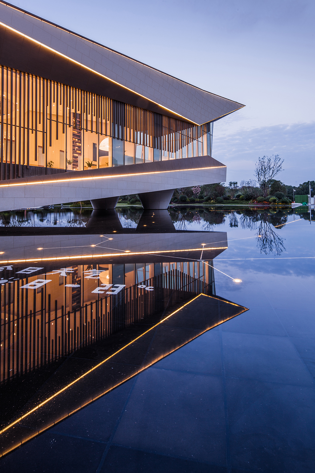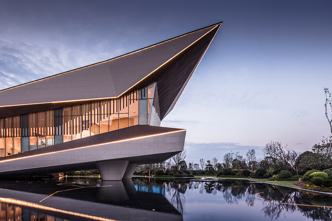 以仿生的手法,利用鋁方通豎條狀序列形成肌理,紋理以翅膀上羽毛為原型,整個(gè)建筑物表現(xiàn)出折面雕塑般的動(dòng)態(tài)整體性。水的出現(xiàn)模糊了建筑內(nèi)和外的界限讓建筑跟環(huán)境充分融合。