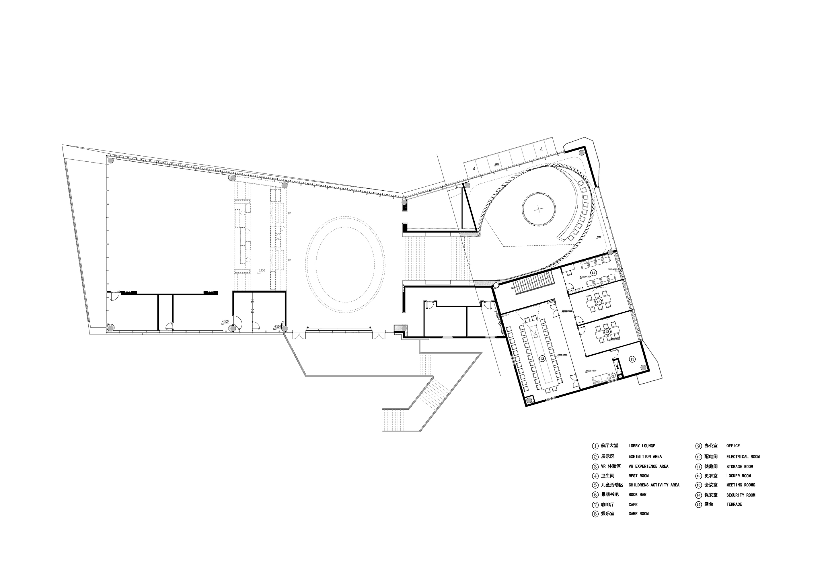 室內(nèi)功能是將建筑所想表述的外在形式視為幾何體量組織成的關(guān)系面,設(shè)有咖啡廳、兒童活動(dòng)區(qū)、娛樂(lè)文化場(chǎng)所、景觀書吧、VR體驗(yàn)區(qū)等一系列體驗(yàn)功能,使空間充分利用并有可延續(xù)性。功能布局的形式能體現(xiàn)空間中的穿連性,不同空間的打開與聚攏,視覺(jué)從寬入窄再到寬,靜靜感受空間的張力,沉浸其中。