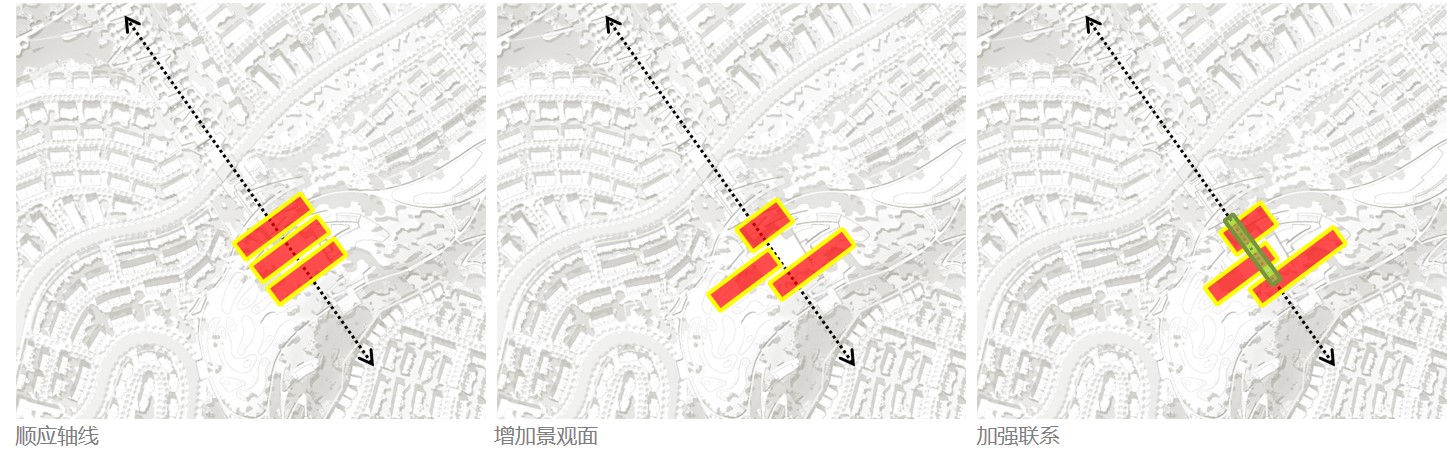 通過這樣的設(shè)計,既滿足與市政道路的銜接關(guān)系,同時又合理利用自然地形的高差,形成層次清晰,高低錯落有致的總體布局形式。