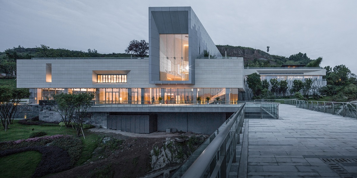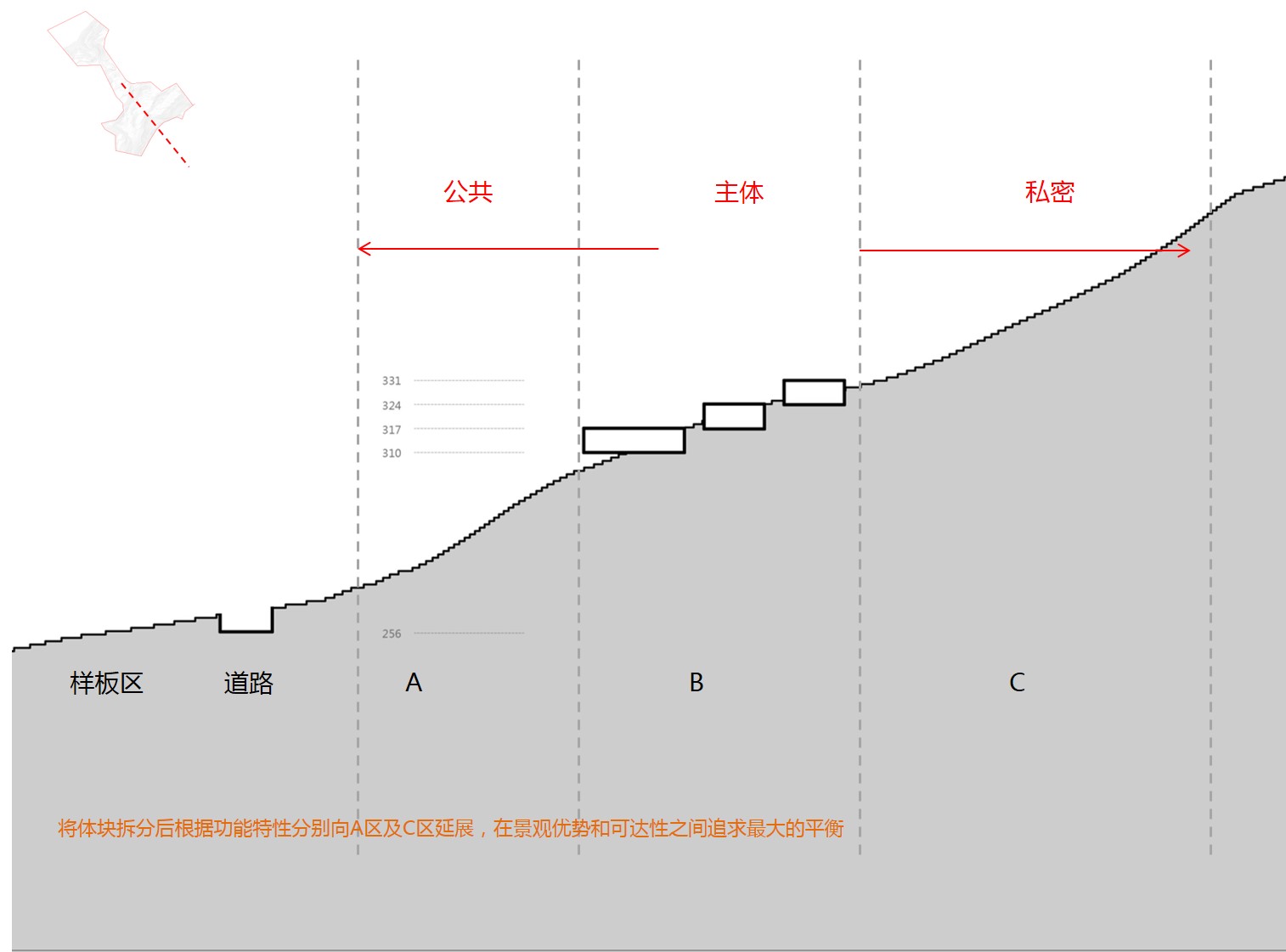 項目是地下一層,地上五層,高度約為23.7米的多層建筑,建筑體依據(jù)地形分成三個平臺拾級而上,同時地塊北側(cè)有作為垂直交通的觀光電梯塔,高度50米。