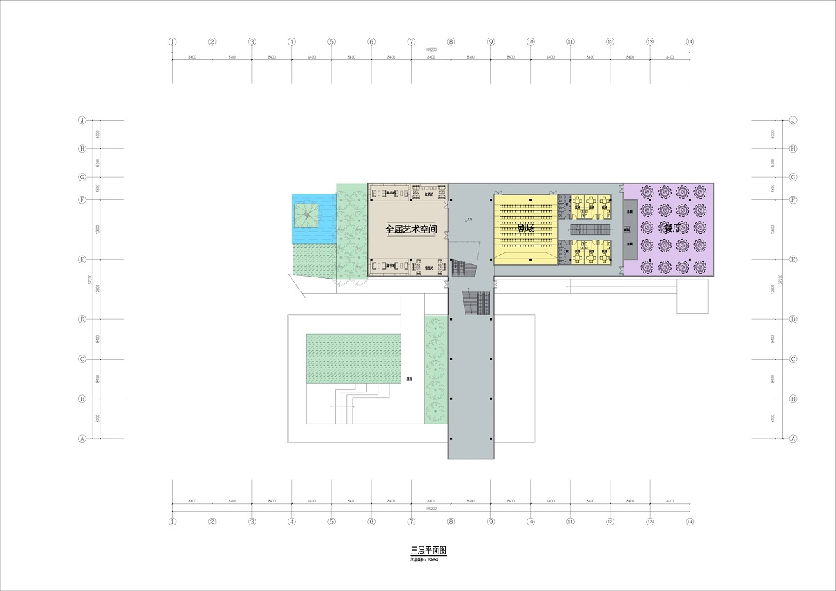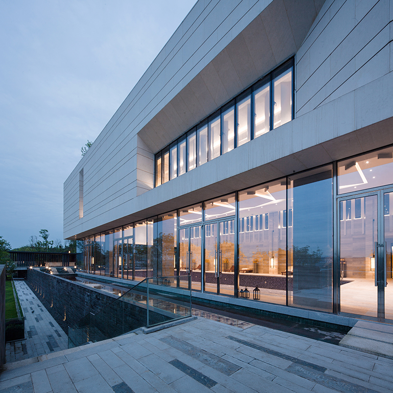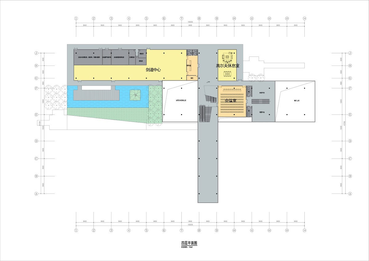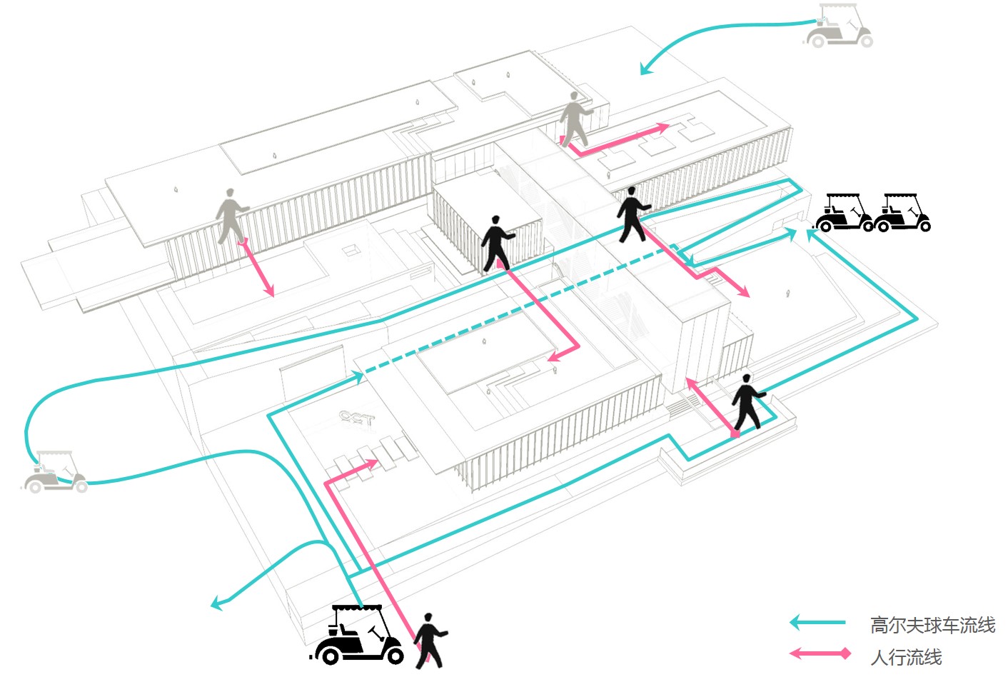空間與形式的關(guān)系,是建筑藝術(shù)和建筑科學(xué)的本質(zhì),在這座小型綜合體中,包含了功能不一的建筑體量,一層功能為室內(nèi)、室外泳池以及健身,室外無邊際泳池與環(huán)境融為一體;二層功能為劍道中心以及泳池上空;順著中央大臺階拾階而上,第三層展現(xiàn)在眼前的是藝術(shù)中心以及多功能廳,三層室外露臺(室內(nèi)泳池屋面)為室外展示場地,可以在氣候適宜的季節(jié)進(jìn)行室外展覽。第四層的功能為生態(tài)展示中心。并以貫通南北的大通廊組織建筑內(nèi)部交通,室外以臺階、坡道以及電梯塔組織場地交通。