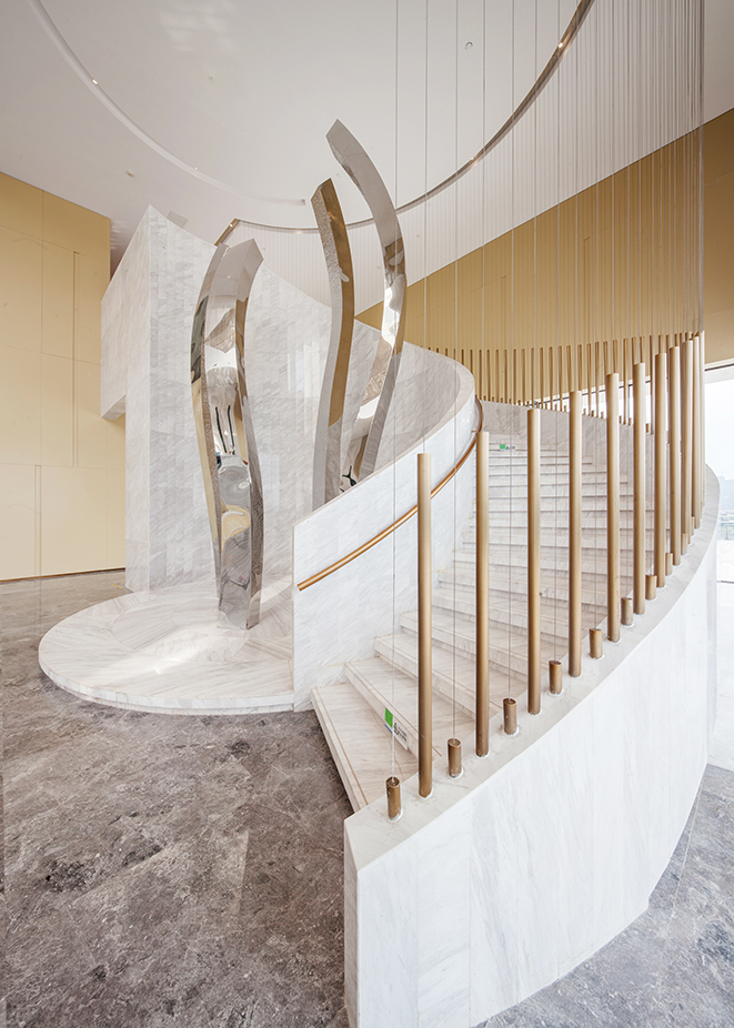 建筑內(nèi)部純白的空間,搭配長而緩上的旋轉(zhuǎn)樓梯制造出內(nèi)部空間在意識上迂回繚繞的戲劇性空間效果。人可以悠然漫步于室內(nèi)空間中,達(dá)到體驗內(nèi)部空間過程與情境的目的。三米見方的魔方體被懸掛在大堂的中軸線上空,鏤空的藝術(shù)圖案透過光孔層層映射,至上而下地傾灑在整個大堂空間。而一系列精細(xì)雕琢的藝術(shù)裝置儼然成為了空間藝術(shù)的一部分。