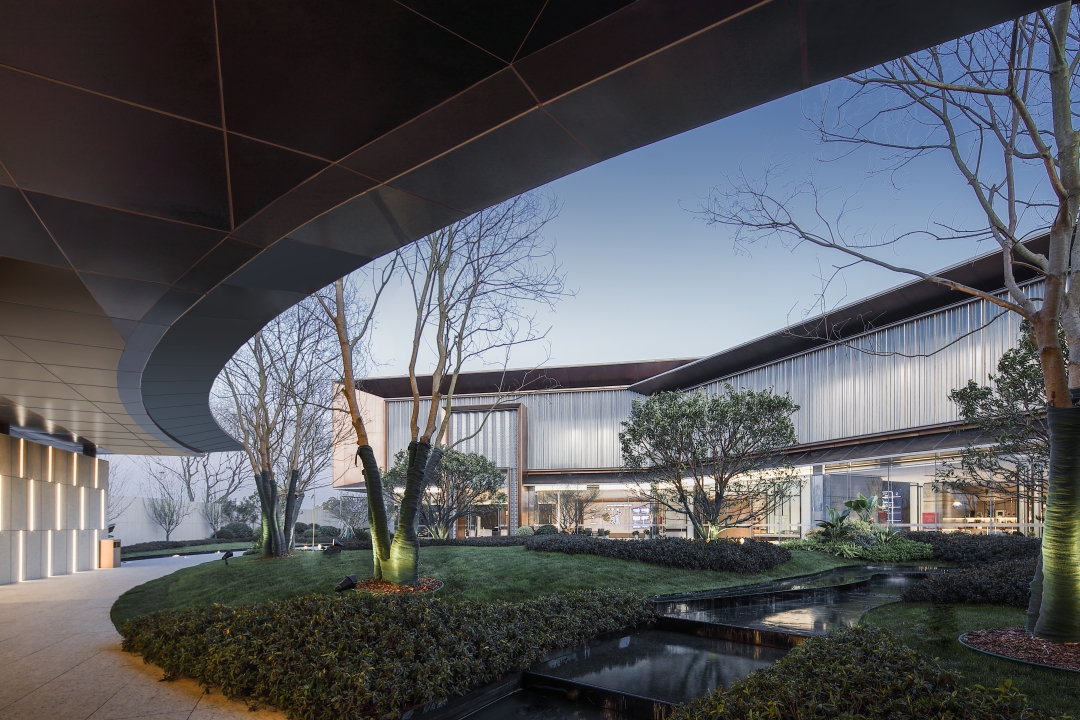 采用內弧形超尺度入口偏置,增加頂部細節(jié)添置趣味空間,進一步增強導視性及昭示性,保證視線集中,結合灰空間打造更具儀式感與品質感的入口。