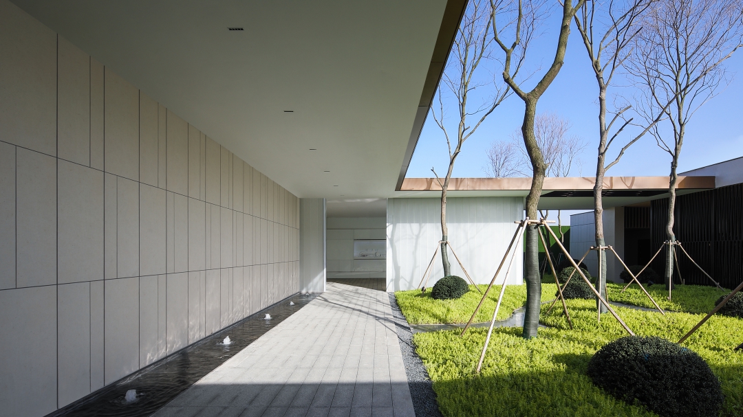 通過連廊圍合出中庭空間,以動線首先穿過連廊,進入生活展示館,再穿過一段廊架進入HUB空間,半圍合式的布局在保持整體一體化的同時,也圍合出多層次的隱密之所。換鞋&等待,可進入兩邊的樣板間。