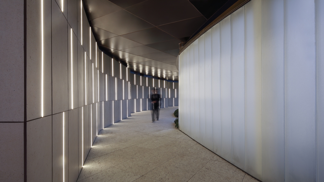 建筑表皮面板用12mm厚超白鋼化玻璃,夾膠玻璃肋支撐;2mm不銹鋼拉絲仿銅;260寬8mm厚雙層U型玻璃正反扣,上下槽式連接,將葡萄牙米黃石材鑲嵌其中。這些材料進行組合與構造,以材料及構造手法保證平整度,建筑表皮細節(jié)上的使用確保了肌理的辨識度。