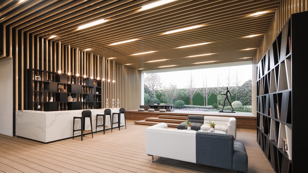 在HUB空內可以近距離接觸自然景觀,時刻體驗室外的環(huán)境。排列有序的木色格構裝飾在空間氛圍設計上營造出一種輕松、愜意、優(yōu)雅格調的感受。從而獲得更為生動豐富的形象體驗,其中再配以安靜柔和的燈光展示,產生深刻的印象和獨特的回憶。