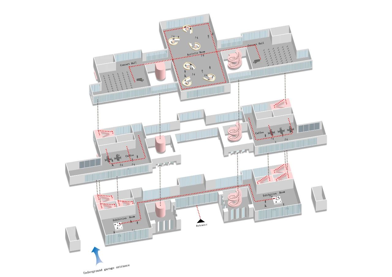 此舉增強空間對觀眾的感受,豐富空間的變化,讓觀眾在觀展時的情緒處于興奮狀態(tài),結(jié)合藝術(shù)作品,更好地將藝術(shù)品與建筑相融合。