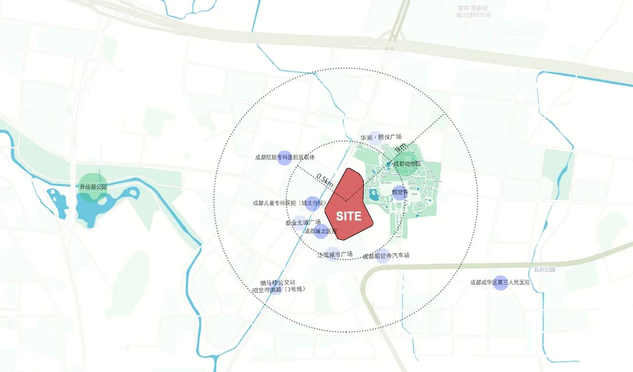 本案位于四川省成都市成華區(qū),昭覺寺南路與中環(huán)路昭覺寺橫路段交叉口東北側(cè),街角界面向城市打開。毗鄰綠化覆蓋高達(dá)88.41% 的昭覺寺城市綠肺區(qū),主城內(nèi)最大城市公園海濱公園。設(shè)計(jì)師希望建造一座成都的又一奢尚中心,延續(xù)商業(yè)氣息秉持奢侈品店般的輕奢質(zhì)感,提升整個城市的審美語境,展現(xiàn)一種高規(guī)格的生活理念。