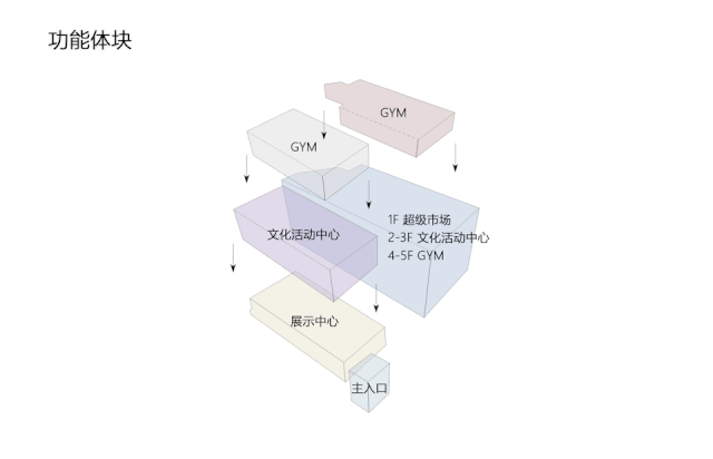 本案分別由五個大小不一的盒子堆疊而成,采用積木式體塊穿插的形式,讓每個盒子相互咬合增強(qiáng)了形體的透視效果,各部分體塊各顯獨(dú)立,卻又緊密相連。同時化解了大體量建筑帶來的沉重與壓抑感,強(qiáng)調(diào)建筑體塊與內(nèi)部功能的有效結(jié)合。設(shè)計(jì)師在街角處以退讓的方式強(qiáng)調(diào)入口,開展與周邊形成相適應(yīng)與平衡的共存關(guān)系,同時也充分的利用建筑用地,創(chuàng)建額外的戶外公共空間。
