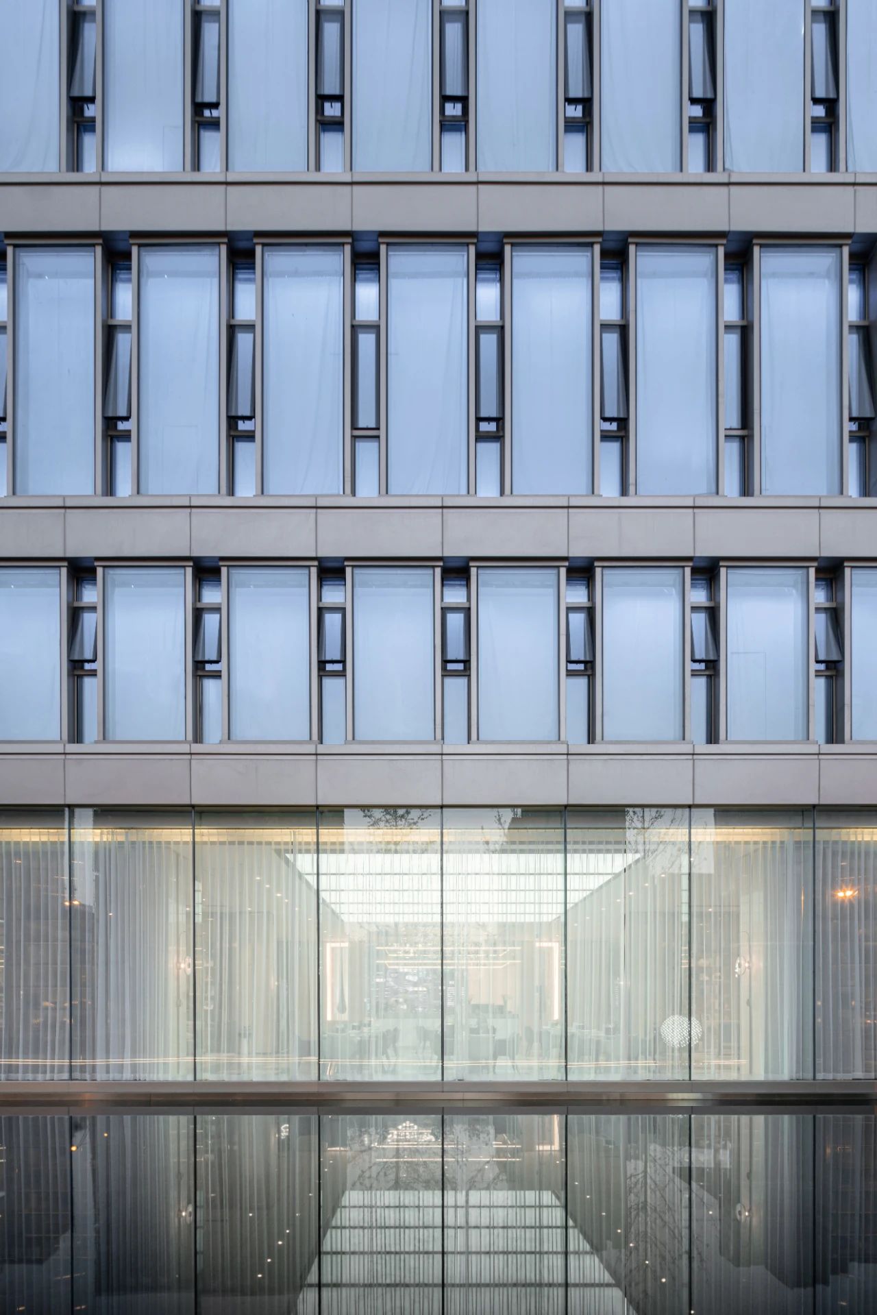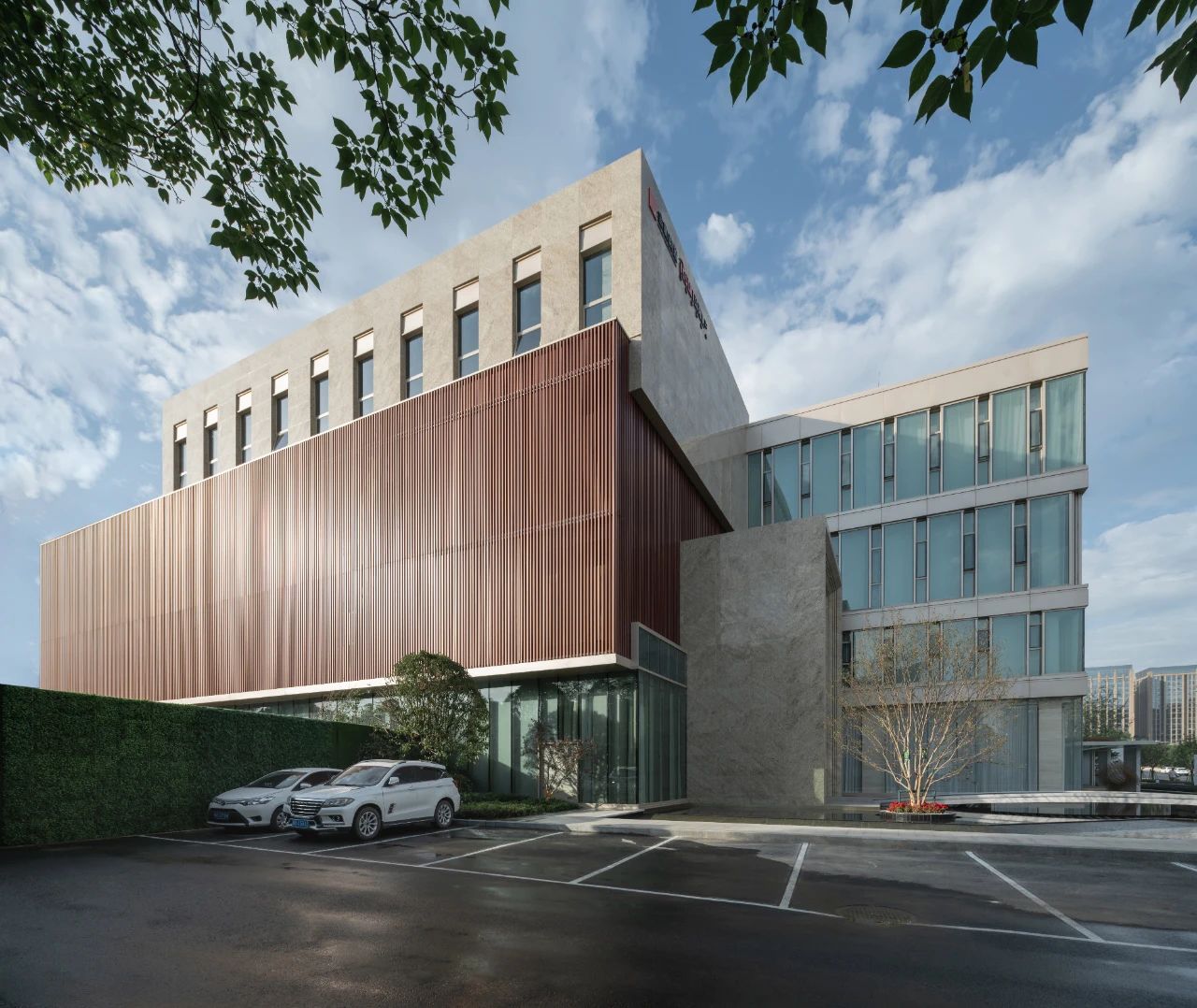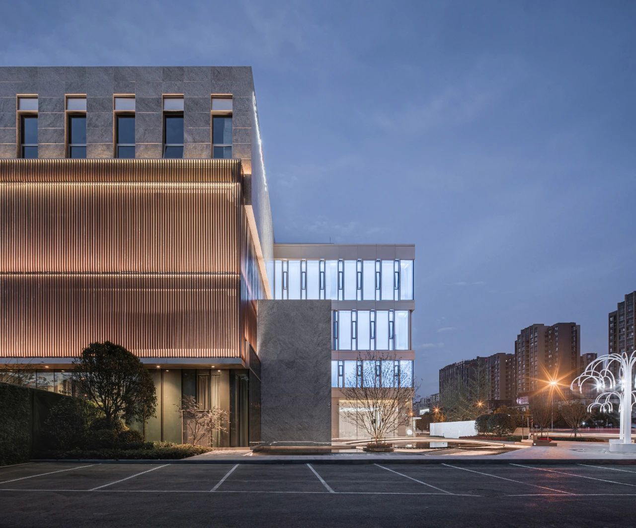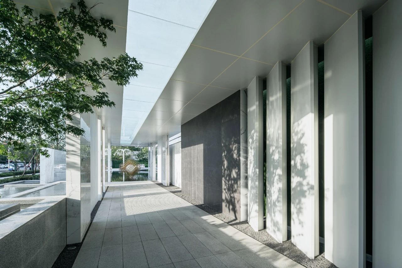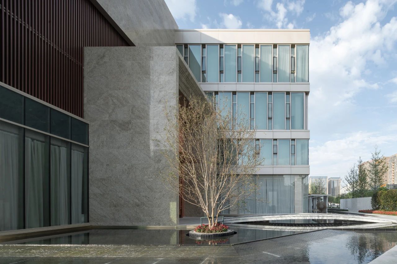 立面材料分兩個主要元素,入口處運(yùn)用米黃色石材和鋁合金格柵幕墻的交織,整體色彩協(xié)調(diào)性較好,實(shí)體墻和半透明材料的交替形成表面的韻律。表皮以統(tǒng)一而富有變化的造型帶來強(qiáng)烈的視覺沖擊,營造出一個潔凈的環(huán)境同時又是相對較為素雅輕奢的立面。