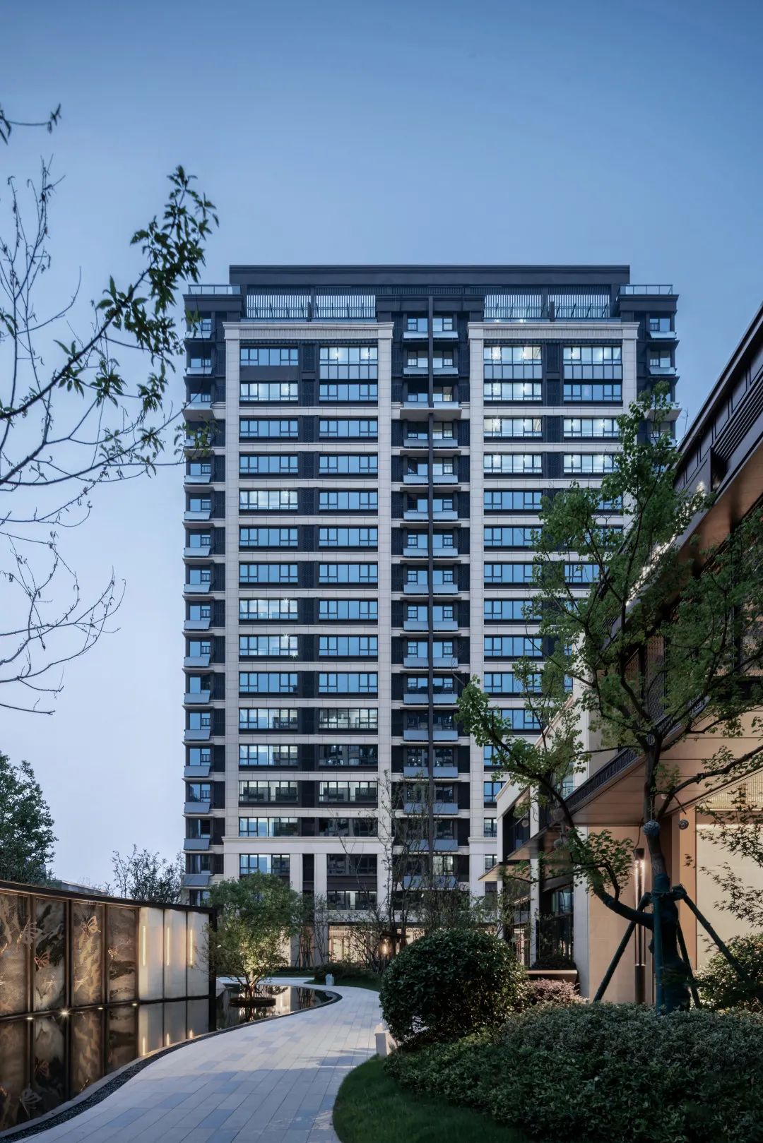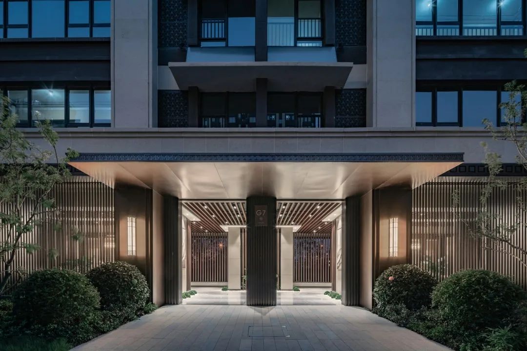 住宅單元入口以近4米的門頭高度,全石材加仿銅拉絲不銹鋼,雕琢出歸家的儀式感。提取中式祥瑞元素,利用祥云符、如意符、回字紋及錦紋,營(yíng)造尊崇感。