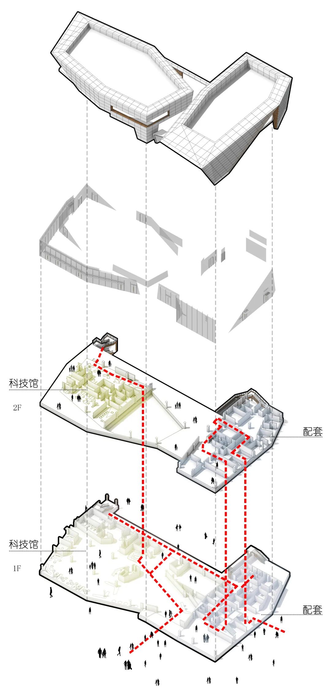 建筑兩部分的轉(zhuǎn)角開口,形成了一個梯形的入口廣場。由此進入經(jīng)過門廳,來訪者可以順著幾何空間不斷向上,參訪兩層的各個主題展廳。展廳的主題則主要關(guān)注于科學和技術(shù)相關(guān)的內(nèi)容,并設(shè)置了可供年輕游客參與的互動裝置,寓教于樂。