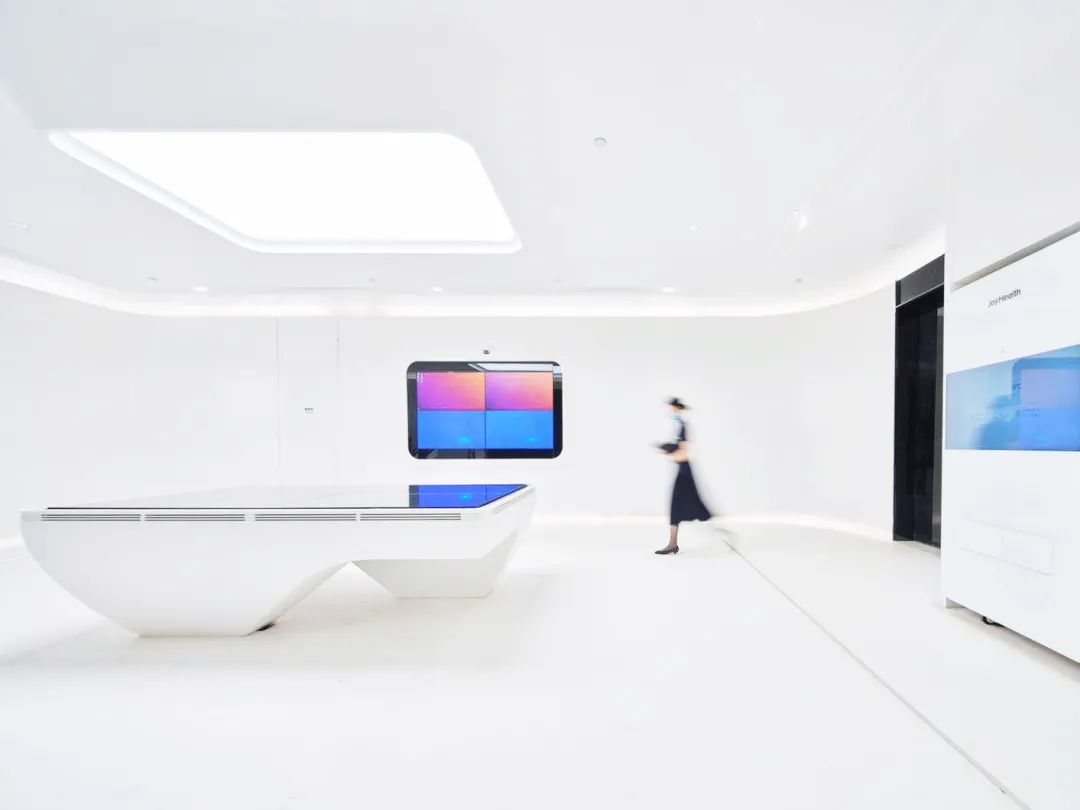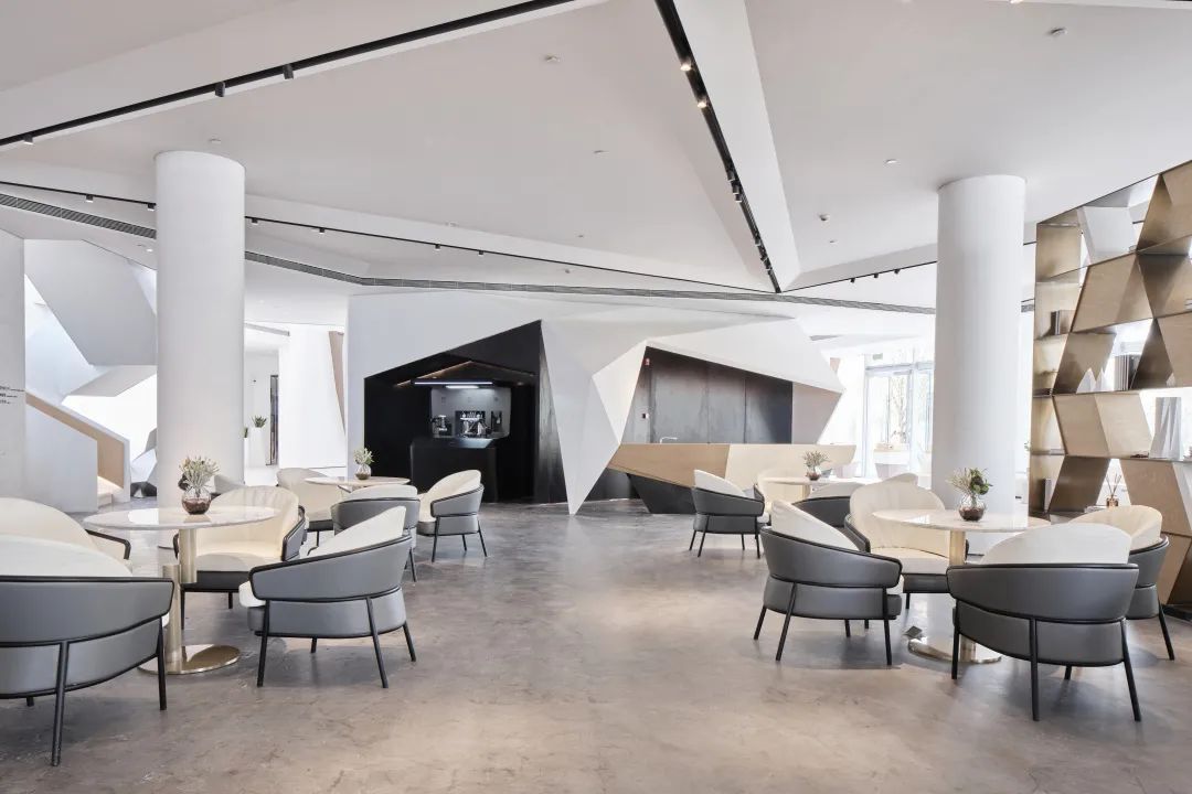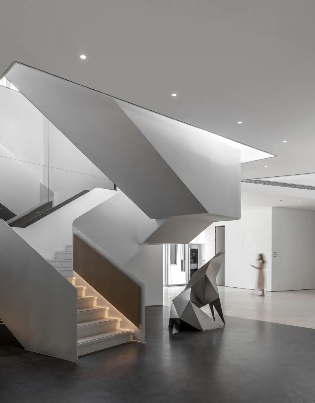 幾何轉(zhuǎn)折的玻璃面、不規(guī)則的折線旋梯,與建筑整體風格相呼應(yīng)的同時,帶來藝術(shù)感和科技感完美結(jié)合的室內(nèi)空間。