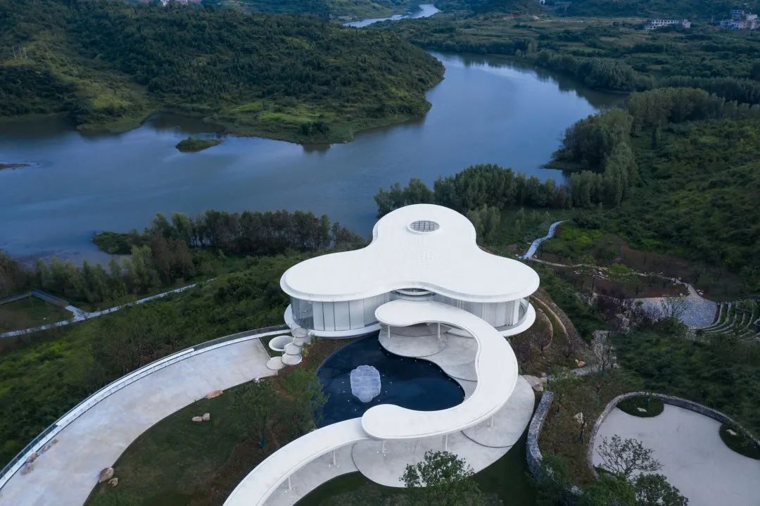 在貴州省清鎮(zhèn)市,蜿蜒的老馬河畔漂浮著一朵潔白的“云朵”,在蔥蔥郁郁的綠樹(shù)中時(shí)隱時(shí)現(xiàn)。這里是清鎮(zhèn)濕地公園里的云朵藝術(shù)館,近觀步移景異,高透的弧形玻璃撐住流暢的云朵造型。