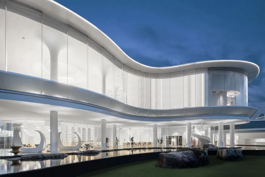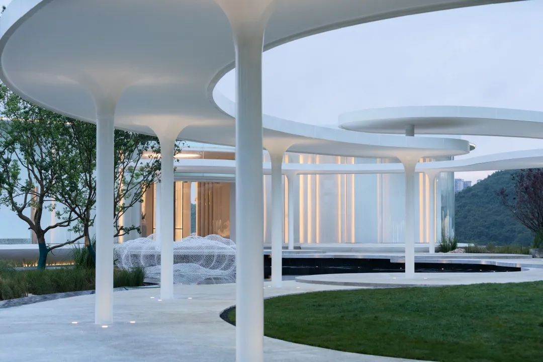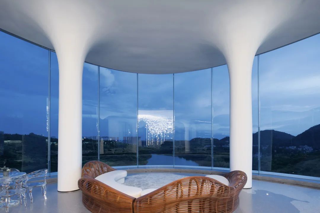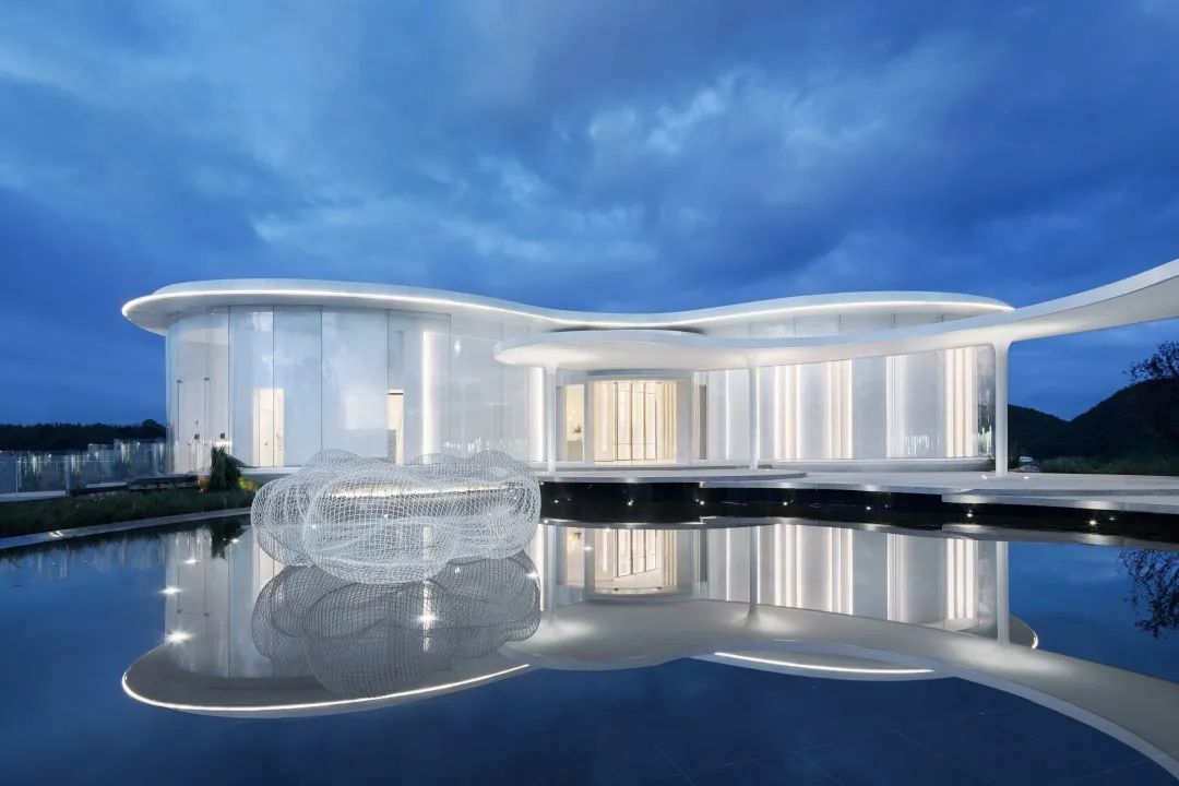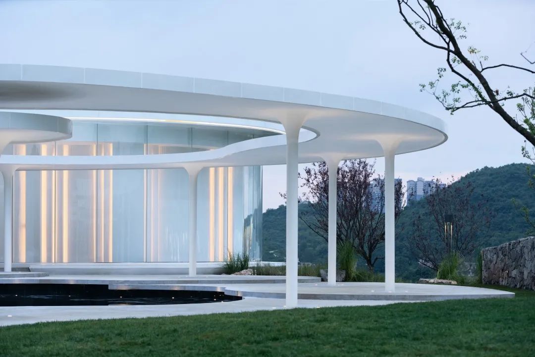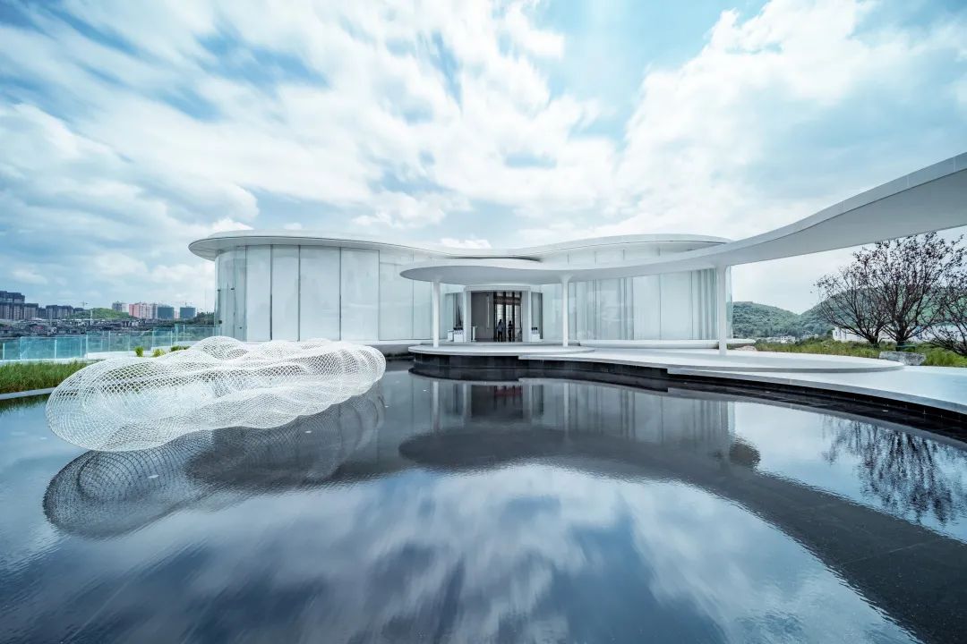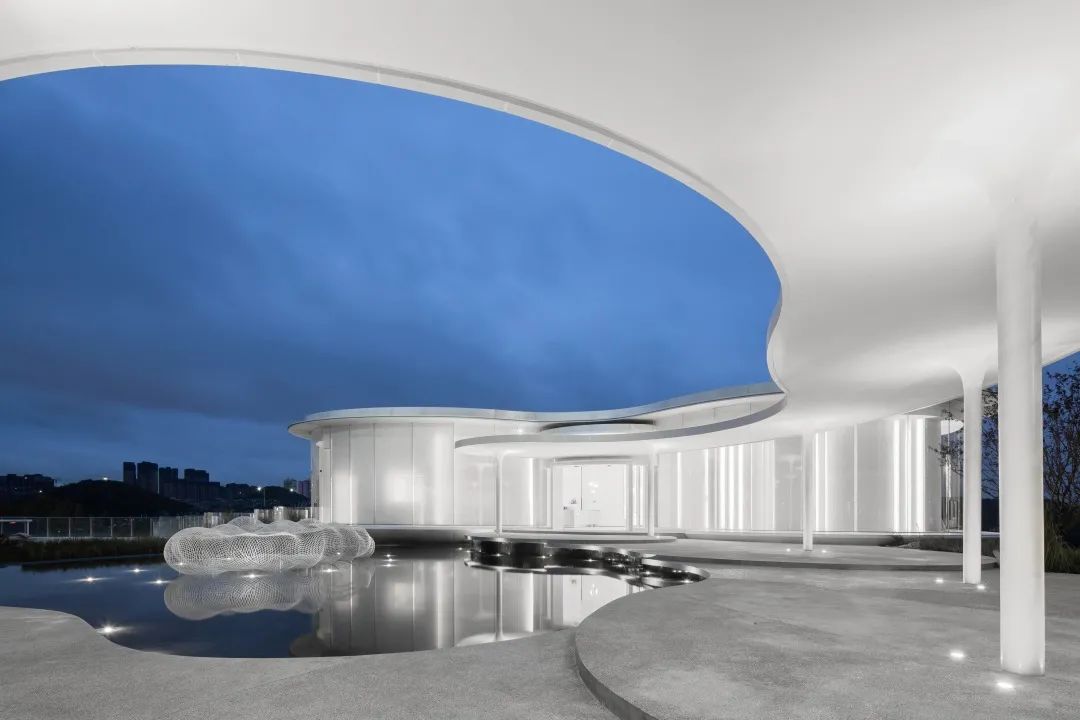 建筑四周完全連續(xù)的玻璃面將室外多維度的景觀滲透到視野內(nèi),使得山、水、景相互交融。整體建筑輕盈通透、色澤柔和,結(jié)合內(nèi)斂的底座空間,更顯藝術(shù)館的氣質(zhì)靈動(dòng)飄逸。