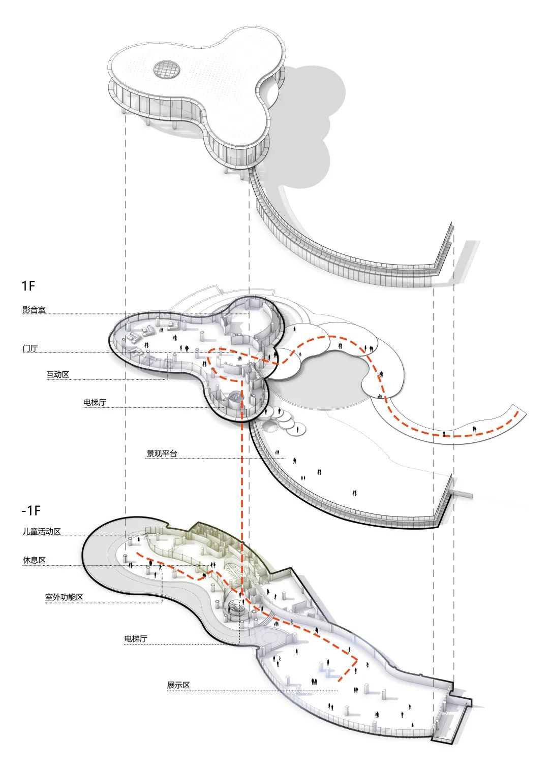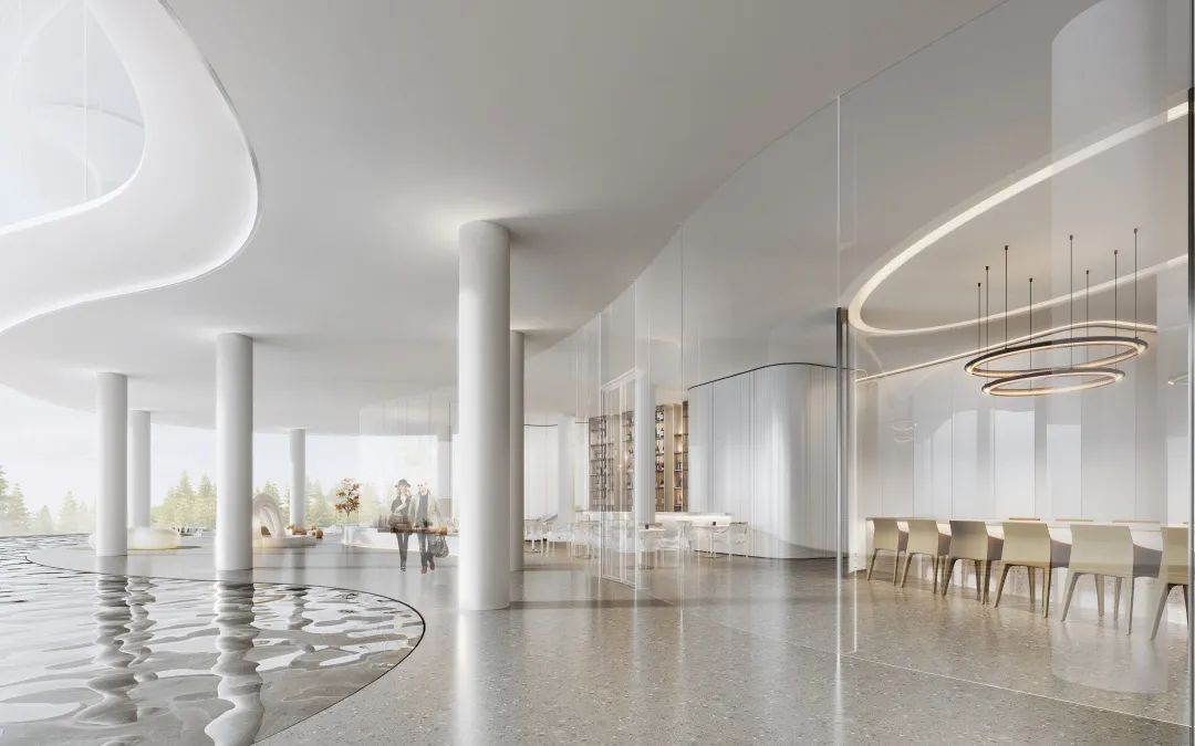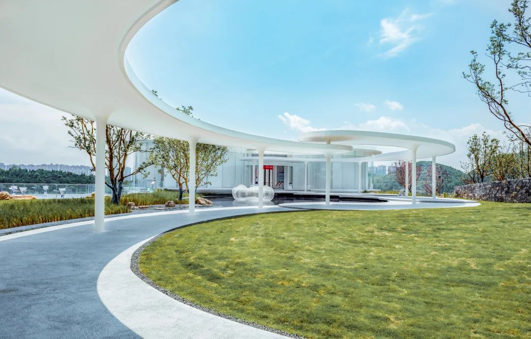 建筑溫柔簡(jiǎn)約的流線造型展現(xiàn)出更寬廣的包容性,潔白的云朵完全去除了地標(biāo)建筑自有的張揚(yáng)侵略感,創(chuàng)造出與山巒、河流共存的一片云。